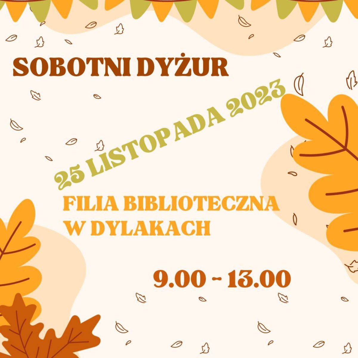 Zachęcamy do skorzystania z oferty Filii Bibliotecznej w Dylakach, która będzie otwarta w najbliższą sobotę, tj. 25 listopada 2023r. w godzinach 9.00 - 13.00. Jednocześnie informujemy, że placówka będzie zamknięta w piątek 24 listopada 2023 r.