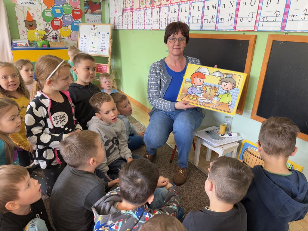 Na wstępie przedszkolaki wysłuchały bajki autorstwa Tomasza Samojlika pt."Cudowne pszczoły " z serii Żubr Pompik, ucząc się przy tym, że są one ważnymi zapylaczami i pomagają rosnąć kwiatom, owocom oraz warzywom. Dowiedziały się również o zwyczajach pszczół, ich pracy w ulu oraz jak powstaje złoty pyszny miód. Po głośnym czytaniu nadszedł czas na zabawę w skojarzenia - zabawę rozpoczęło słowo "pszczoła", które rozbudziło dziecięcą wyobraźnię.
