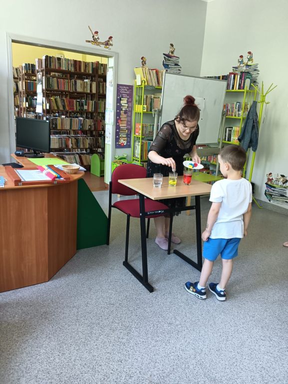Z niej dowiedzieliśmy się, że najważniejsze to lubić i akceptować siebie, bo każdy z nas jest wartościowy. Każdy z nas ma pewne talenty. Po tej części nasi goście mogli poczuć się jak główna postać z bajki, ponieważ w zabawie wykorzystaliśmy charakterystyczne dla tego zwierzątka cechy wyglądu i umiejętności. Próbowaliśmy złapać długim, rozwijającym się językiem muchy, zabawić się w czarodzieja i zmienić kolory podstawowe w pochodne czy też pobawić się w spostrzegawczość w kilkuminutowej gimnastyce. Następnie dzieci mogły pokolorować kameleona według własnego uznania i poprzeglądać książeczki dostępne na naszych półeczkach.