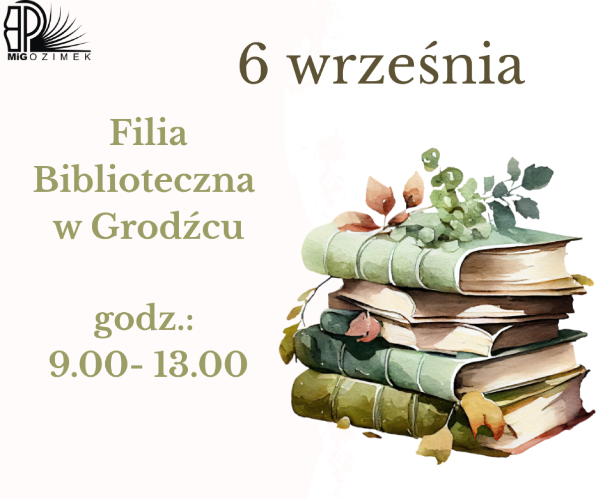 W sobotę, 6 września 2025, będzie otwarta Filia Biblioteczna w Grodźcu. Zapraszamy w godzinach 9.00 - 13.00.