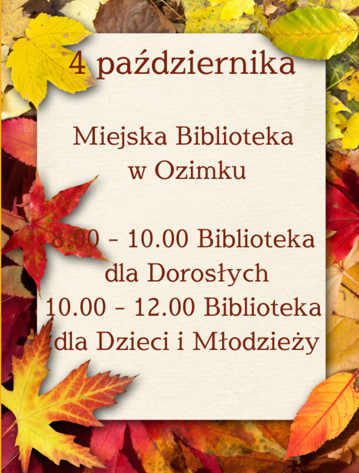 4 pażdziernika 2025 Miejska Biblioteka będzie pełniła sobotni dyżur. Zapraszamy w godzinach:
