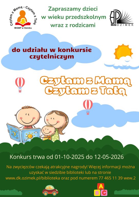 Od 1 października rusza kolejna edycja konkursu czytelniczego dla przedszkolaków i ich rodziców pn. "Czytam z Mamą - Czytam z Tatą". Wszystkich zainteresowanych zapraszamy do Oddziału dla Dzieci i Młodzieży w celu wypełnienia karty zgłoszenia i odebrania karty, na której dzieci będą zbierały punkty za odwiedzanie biblioteki, wypożyczanie książek i rozwiązywanie zadań przygotowanych do wybranych pozycji książkowych.