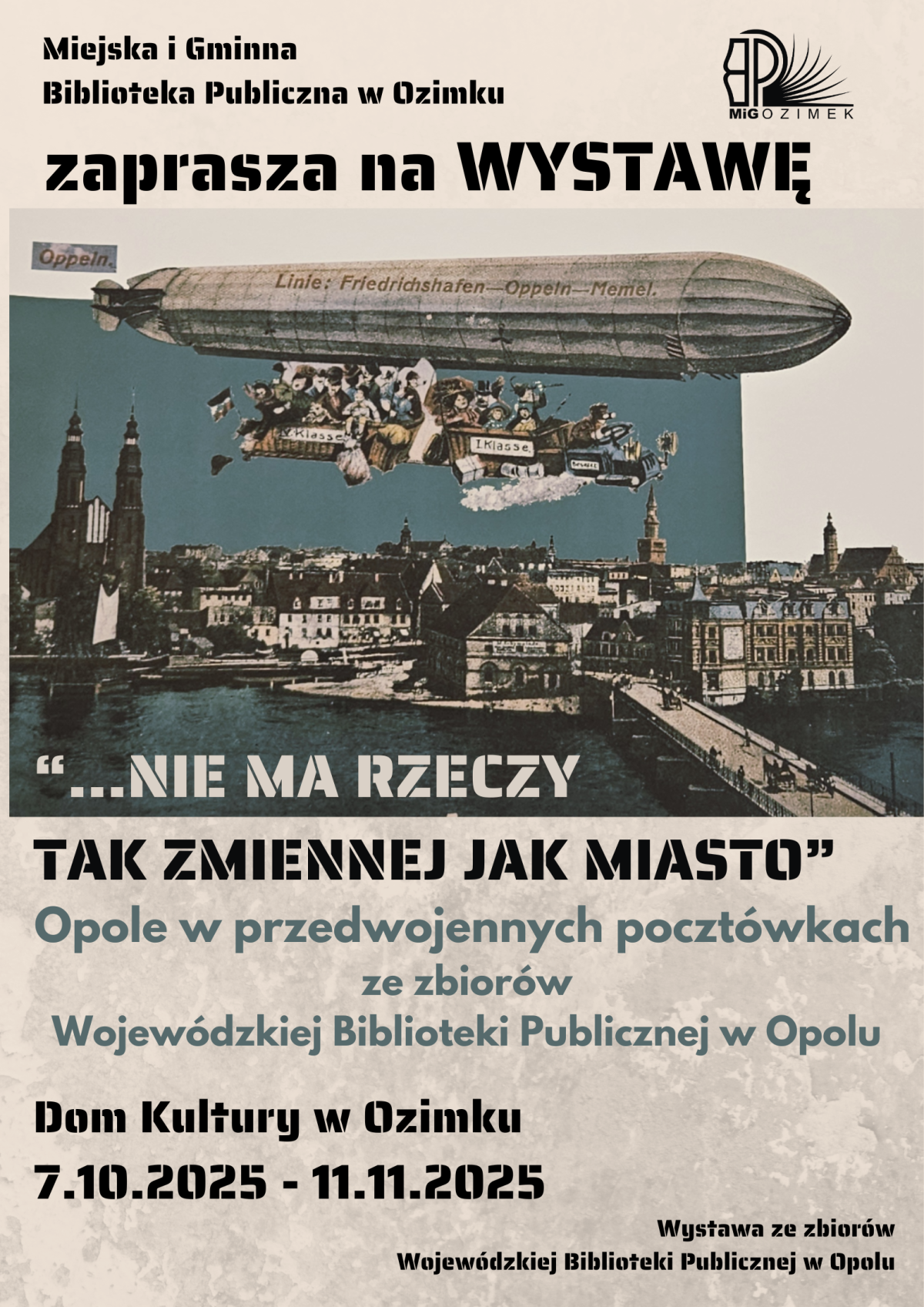 Wystawa „…nie ma rzeczy tak zmiennej jak miasto. Opole w przedwojennych pocztówkach ze zbiorów Wojewódzkiej Biblioteki Publicznej w Opolu” jest okazją do pokazania nieprezentowanych jeszcze szerokiemu gronu odbiorców zabytkowych pocztówek Opola. Na przedwojennych kartach pocztowych można zobaczyć, jak ponad sto lat temu wyglądały poszczególne ulice, budynki, place, kościoły naszego miasta wojewódzkiego.