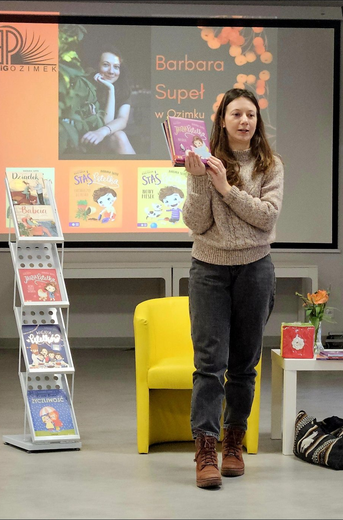 Pierwsze spotkanie odbyło się w Sali Kameralnej Domu Kultury w Ozimku. Uczestniczyła w nim grupa Tygrysków z PP nr 1 z Ozimka. Dzieci doskonale znały całą rodzinę Pętelków: Stasia, Jadzię, Szczepcia, mamę, tatę, pieska Pirata, a nawet pluszowego leniwca. Chętnie też włączyły się do zabaw zaproponowanych przez pisarkę. Następnie wysłuchały fragmentu książki o Stasiu Pętelce i wykonały wspólną pracę plastyczną rozwijającą ich kreatywność i wyobraźnię.