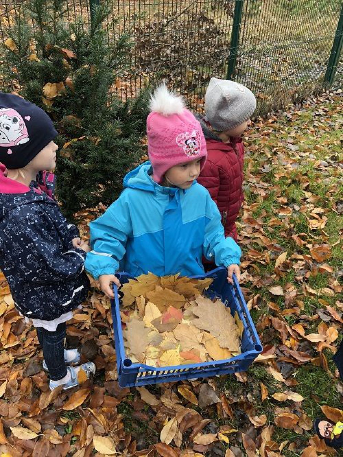 Na zakończeni grupa maluchów zebrała resztę liści do koszyczka i zaniosła do ogrodu, aby zwierzątka mogły się schować w czasie zimy pod taką naturalną ciepłą kołderką