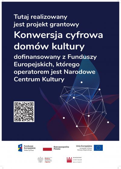 "Konwersja cyfrowa domów kultury" to projekt o charakterze systemowym, uruchomiony w ramach Programu Operacyjnego Polska Cyfrowa na lata 2014-2020 III Osi Programu - Zwiększenie stopnia oraz poprawa umiejętności korzystania z internetu, w tym e-usług publicznych w szczególności podnoszenia kompetencji cyfrowych na poziomie lokalnym. 3.2 "Innowacyjne rozwiązania na rzecz aktywizacji cyfrowej"