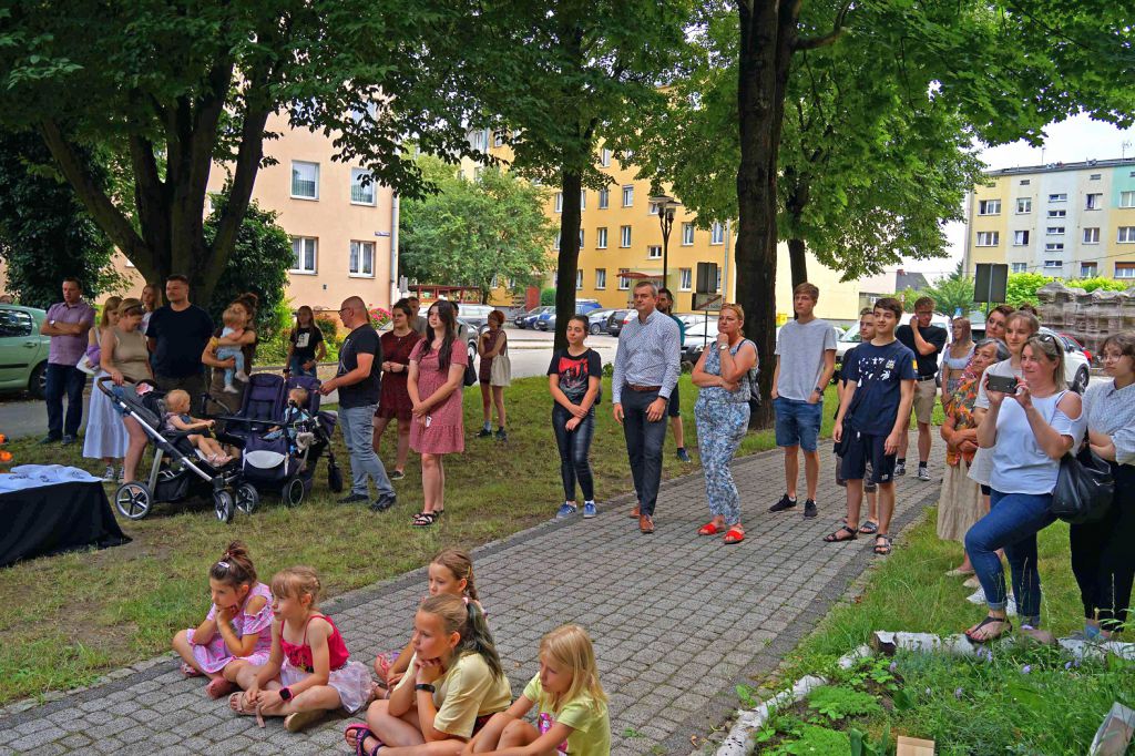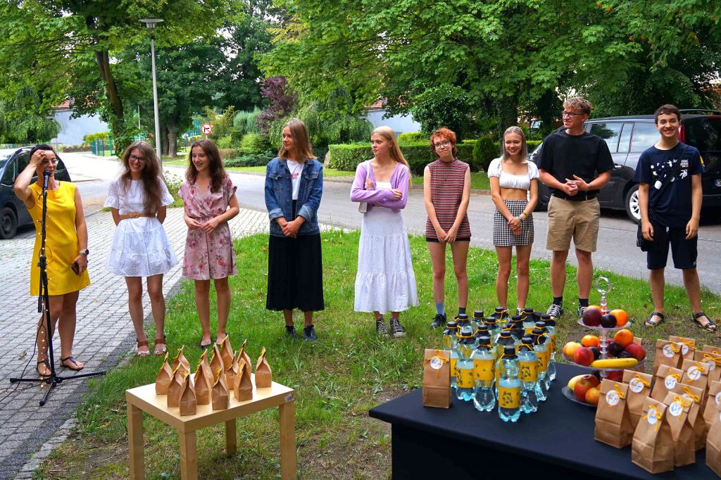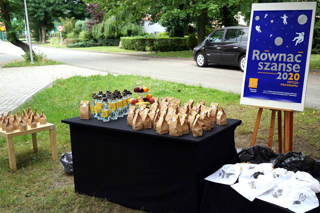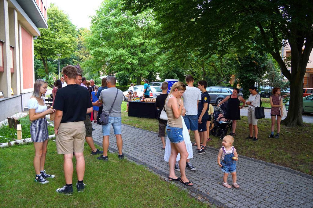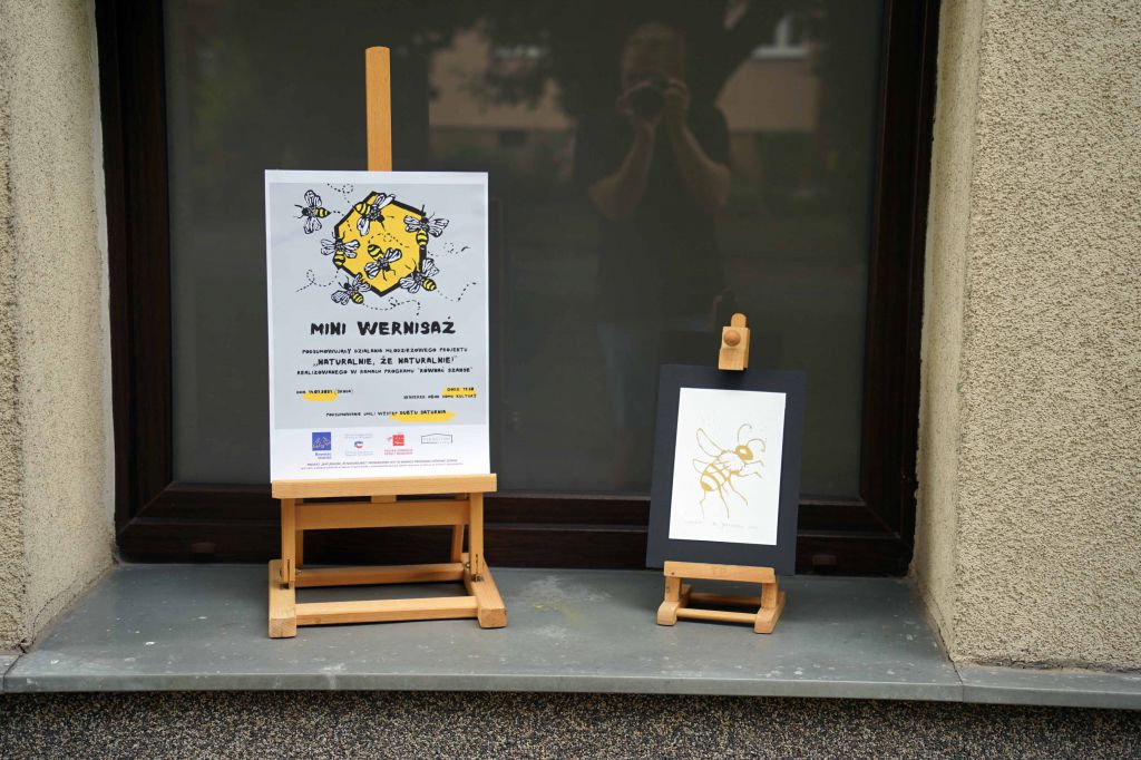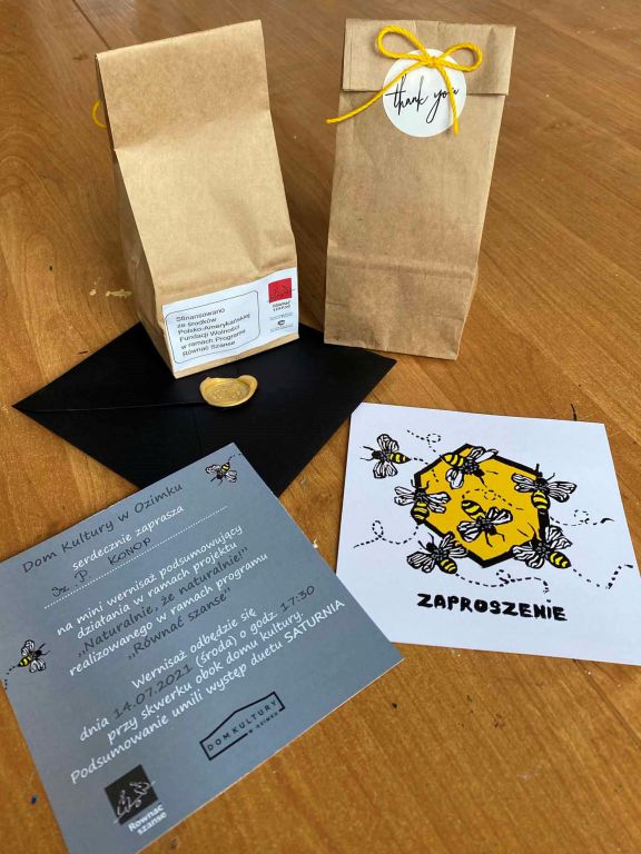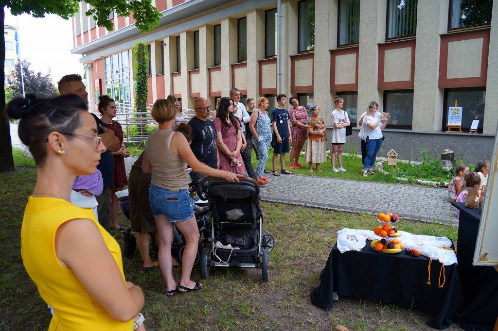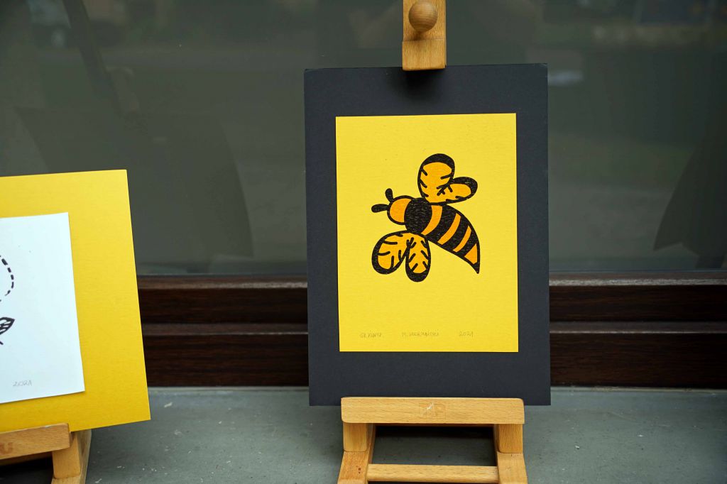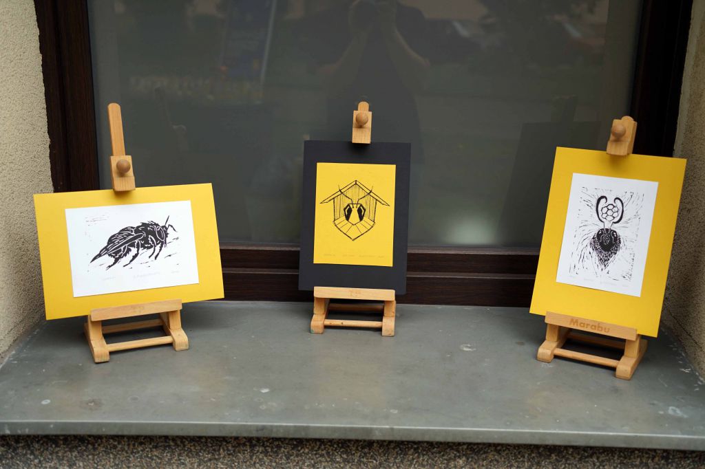 Całość zwieńczył lipcowy wernisaż na świeżym powietrzu – przy gotowym skwerku, w pszczelim czarno-żółtym klimacie, z wystawą linorytów i woreczków, poczęstunkiem z lokalnym miodem i mini koncertem młodego duetu SATURNIA.