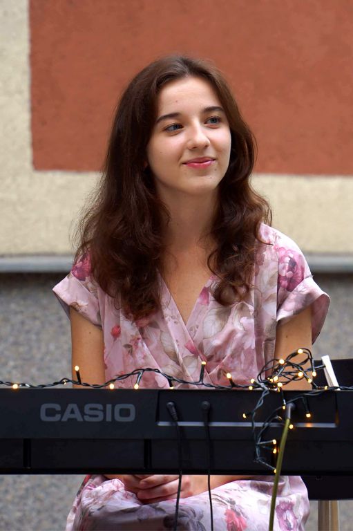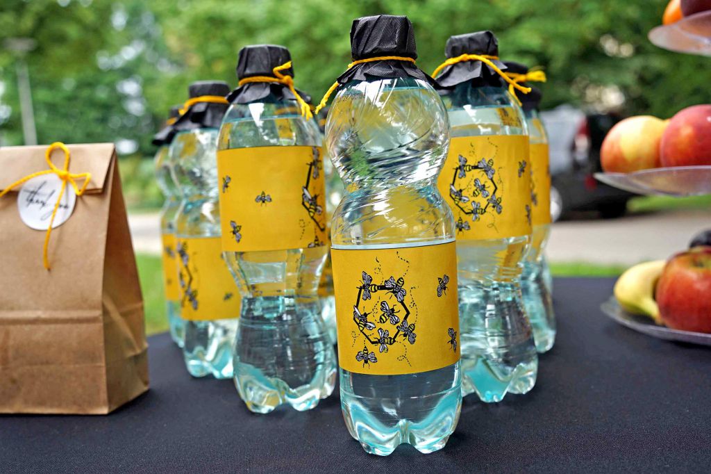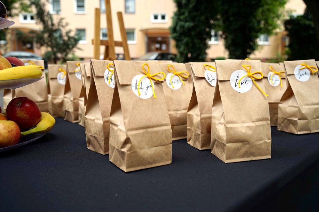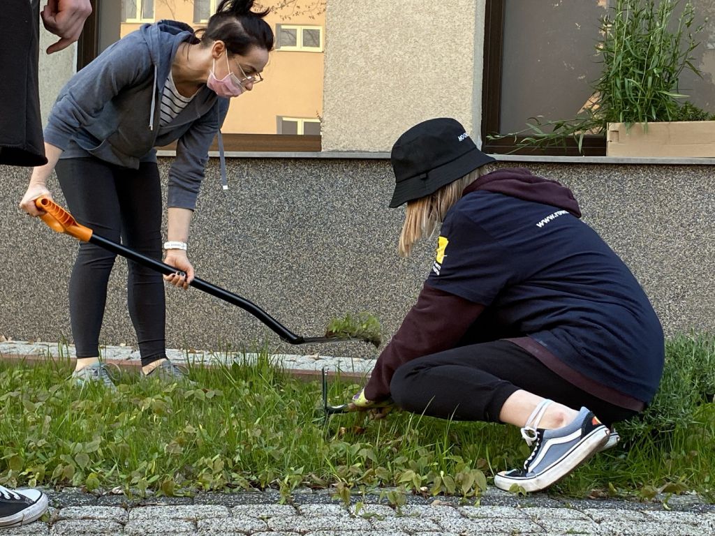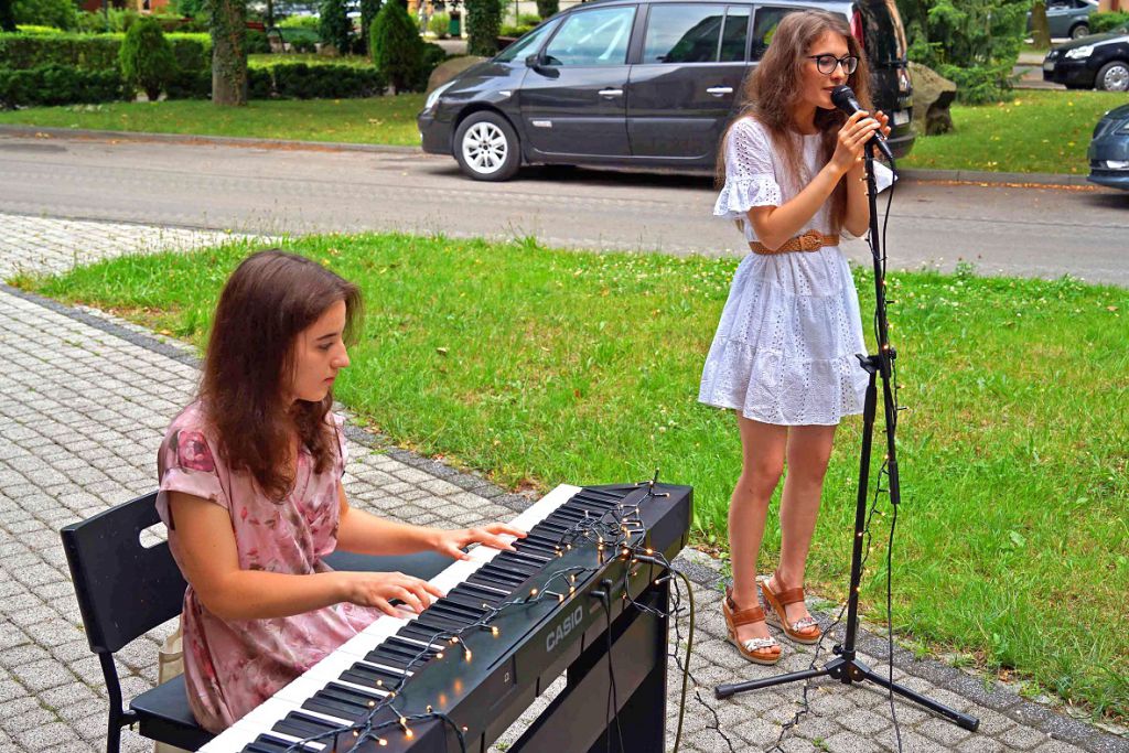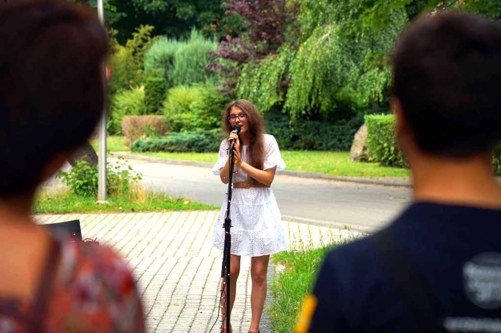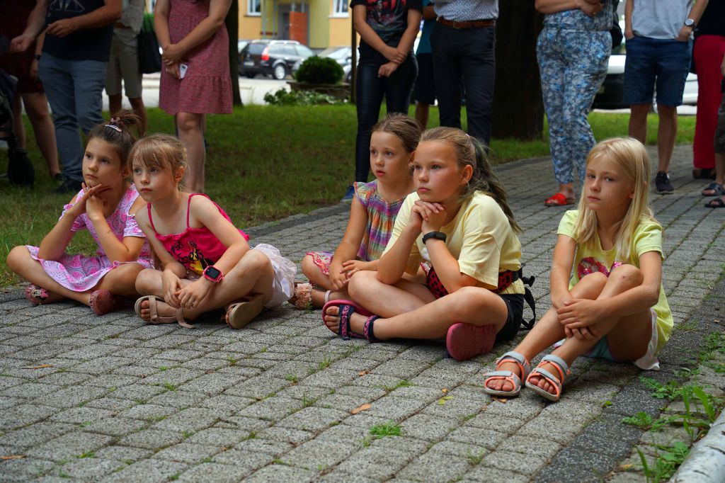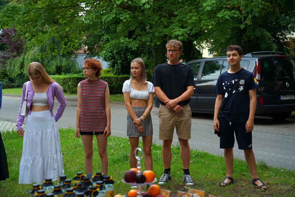 Całość zwieńczył lipcowy wernisaż na świeżym powietrzu – przy gotowym skwerku, w pszczelim czarno-żółtym klimacie, z wystawą linorytów i woreczków, poczęstunkiem z lokalnym miodem i mini koncertem młodego duetu SATURNIA.