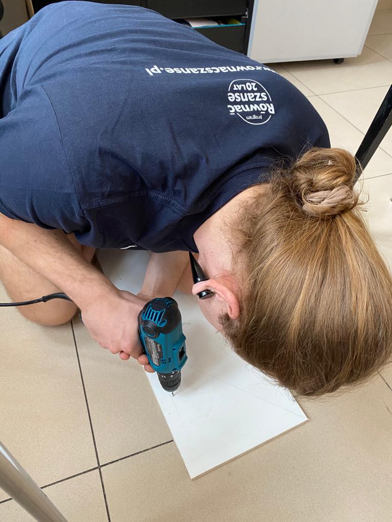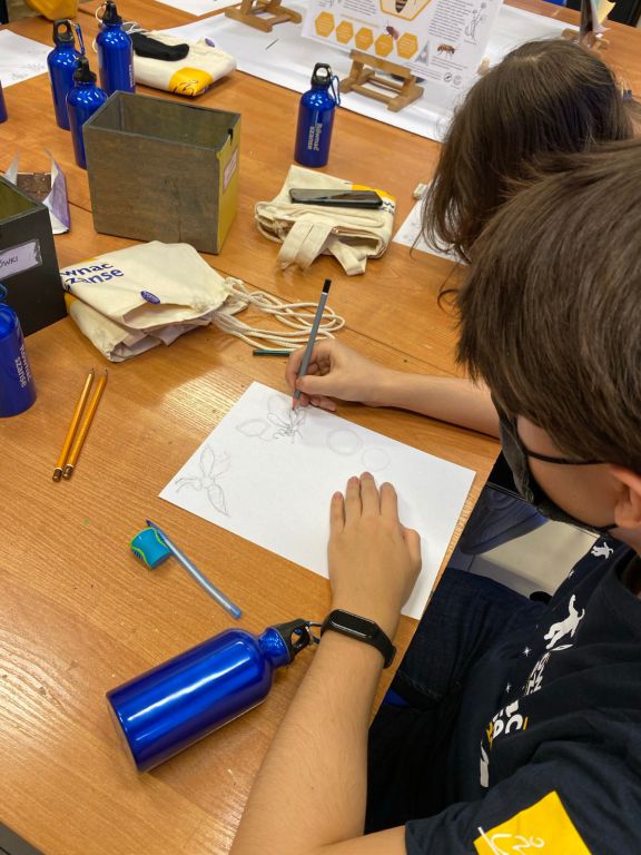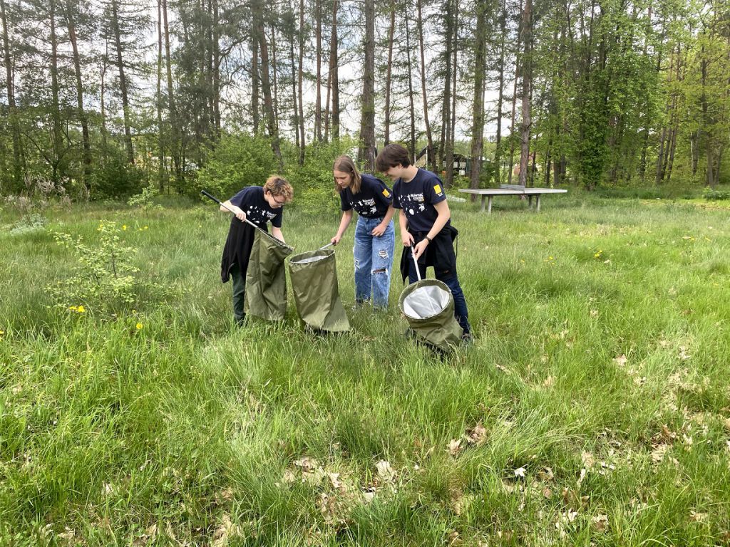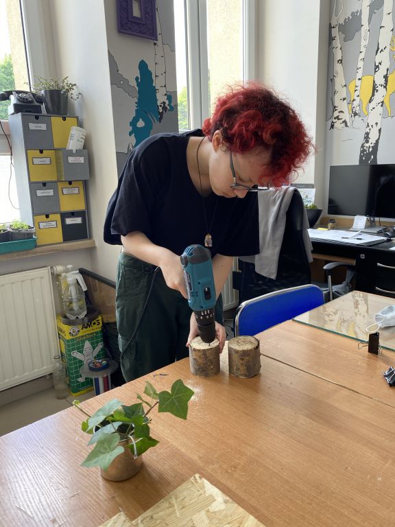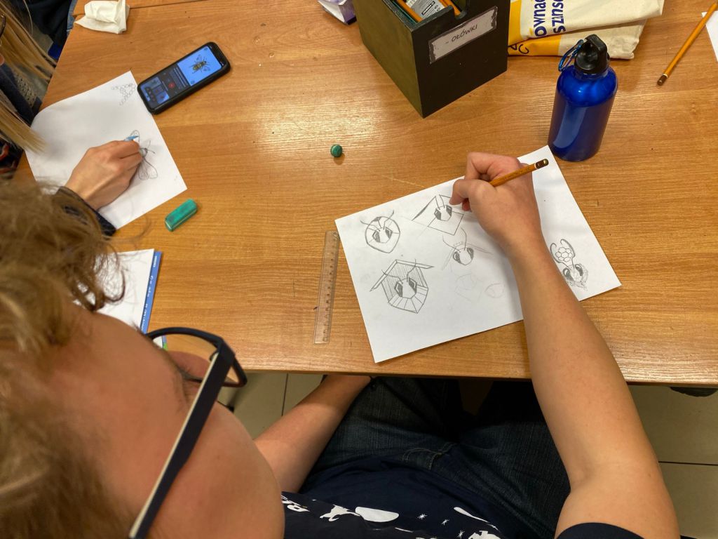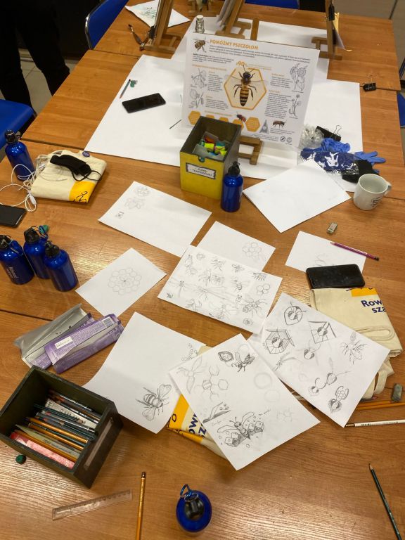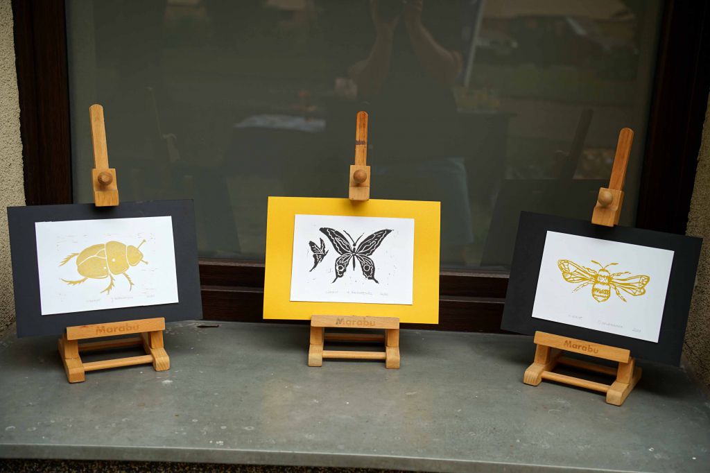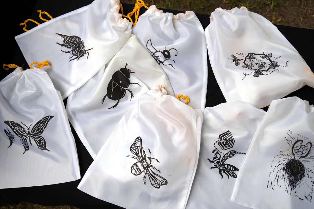 Równolegle w pracowni grafiki warsztatowej powstawały matryce linorytnicze z portretami owadów i motywami dzikich łąk – odbitki trafiły na ekologiczne woreczki uszyte z resztek materiałów krawieckich, będące praktyczną alternatywą dla plastikowych reklamówek.