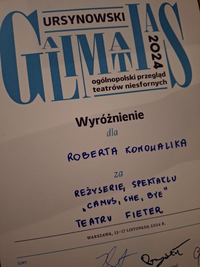 17 listopada 2024r. Robert Konowalik otrzymał wyróżnienie za reżyserię spektaklu teatru Fieter CAMUS "SHE, BYE" podczas Ogólnopolskiego Festiwalu Teatrów Niesfornych GALIMATIAS.