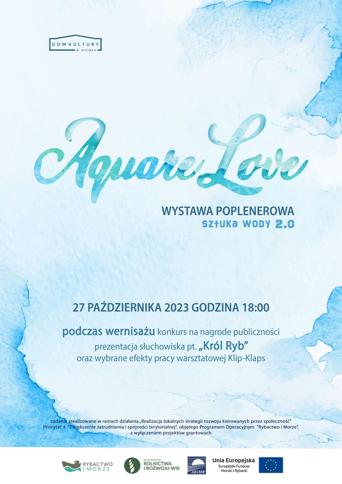 W holu Domu Kultury w Ozimku odbył się wernisaż „AquareLove”, którego nazwa wskazywała na zamiłowanie do tworzenia prac plastycznych za pomocą farb akwarelowych. Wystawa była podsumowaniem plenerów malarskich na terenie Ośrodka Zarybieniowego „Poliwoda” w Biestrzynniku w ramach projektu: „Sztuka Wody 2.0”. Powstałe obrazy zostały wyeksponowane w formie wystawy w holu Domu Kultury i stanowiły element promocji zasobów rybackich i akwakultury. Dzień wcześniej odbyła się prapremiera wystawy, podczas której zebrana publiczność obejrzała wszystkie, jeszcze niepodpisane prace i zagłosowała na swoich faworytów.