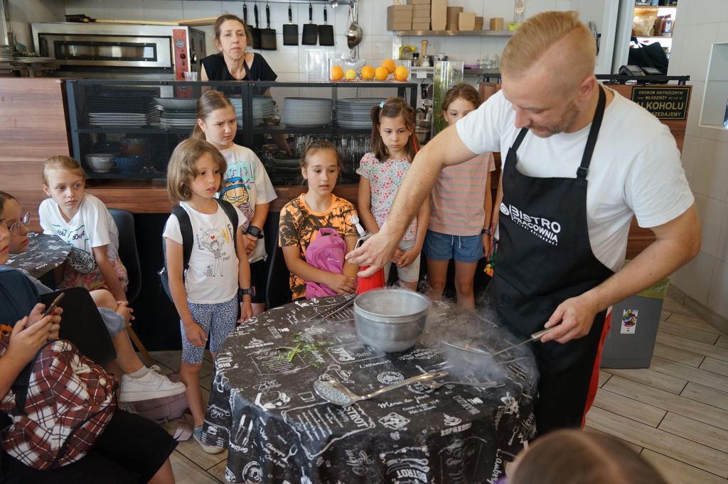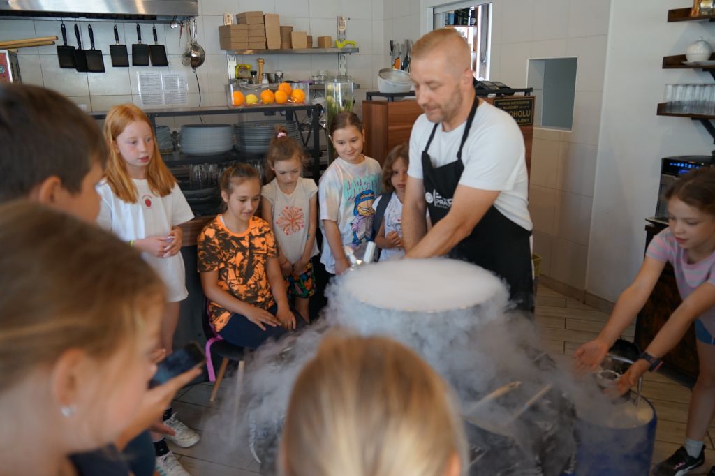 Wtorek rozpoczął się od ponownej wizyty w „Bistro Pracowni Sztuki Kulinarnej” tym razem na uczestników czekało doświadczanie kuchni molekularnej. Szał wzbudziły smocze ciastka, czekoladowe z bitą śmietaną, po których zjedzeniu leciała dzieciom para z nosa. Zupełnie tak, jakby zrobił je sam Willy Wonka. Szef kuchni, Łukasz Szewczyk, przygotował dla dzieci arbuzowy sorbet i lody kokosowe. Nie były to jednak standardowe produkty. Sorbet był stworzony za pomocą dodania musu arbuzowego do ciekłego azotu. Lody natomiast składały się głównie z wyżej wspominanego gazu z dodatkiem ekstraktu o smaku kokosa i syropu Blue Curacao. Kuchnia molekularna zrobiła furorę wśród dzieci, które podziwiały umiejętności Pana Łukasza. Po godzinie pełnej wrażeń na grupę czekał słodki poczęstunek. Reszta dnia była skupiona na zajęciach muzycznych prowadzonych przez Pana Pawła Wielgusa. Podczas których uczestnicy uczyli się wakacyjnej piosenki.