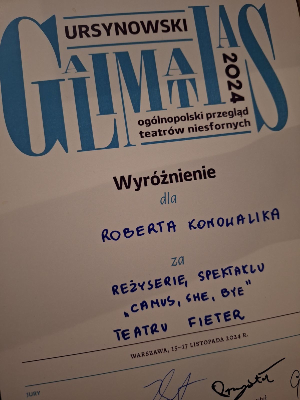 Wyróżnienie za reżyserię spektaklu teatru Fieter CAMUS SHE, BYE