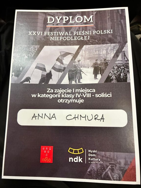 na XXVI Festiwalu Pieśni Polski Niepodległejw w Nysie, w kategorii soliści (klasy IV–VIII).