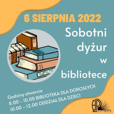 Przypominamy, że sobotę 6 sierpnia 2022 biblioteka miejska będzie otwarta w godzinach 8.00 – 12.00.