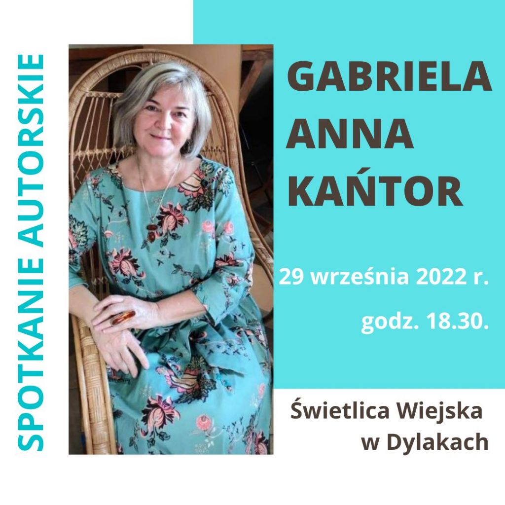 W czwartek 29 września 2022 roku o godz. 18.30 w Świetlicy Wiejskiej w Dylakach odbędzie się spotkanie z Gabrielą Anną Kańtor, autorką takich książek jak „Śląski Kopciuszek”, „Pani na Kopicach”, „Ławeczka księżnej Daisy”, „Trzecia miłość Marianny Orańskiej” oraz „Bachantka na panterze”.