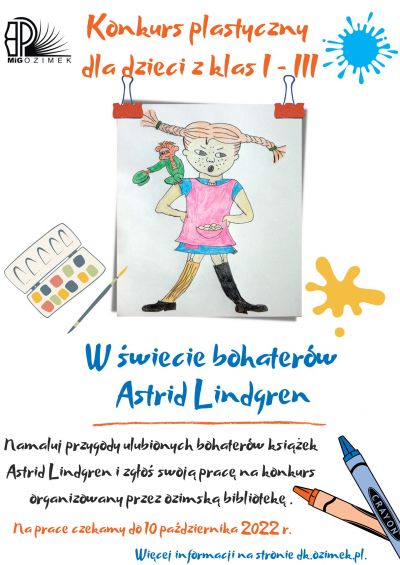 Zachęcamy dzieci z klas I - III szkół podstawowych z terenu gminy Ozimek do udziału w konkursie plastycznym pn. "W świecie bohaterów Astrid Lindgren". Zadanie konkursowe polega na samodzielnym wykonaniu pracy plastycznej przedstawiającej bohaterów książek Astrid Lindgren lub ich przygody. Na prace, do których należy załączyć kartę uczestnika, czekamy do 10 października 2022.