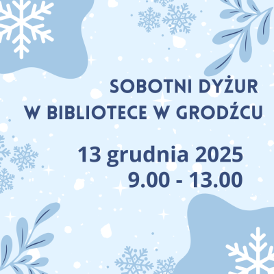 Zachęcamy do skorzystania z ostatniego w tym roku sobotniego dyżuru bibliotecznego. 13 grudnia nasza Filia w Grodźcu będzie czynna w godzinach 9.00 - 13.00. Jednocześnie informujemy, że w zwiążku z powyższym biblioteka będzie nieczynna w dniu 23 grudnia.
