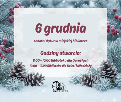 Gorąco zachęcamy do skorzystania z oferty miejskiej biblioteki w dniu 6 grudnia, w którym placówka będzie pełniła sobotni dyżur. Zapraszamy, jak zawsze, w godzinach: