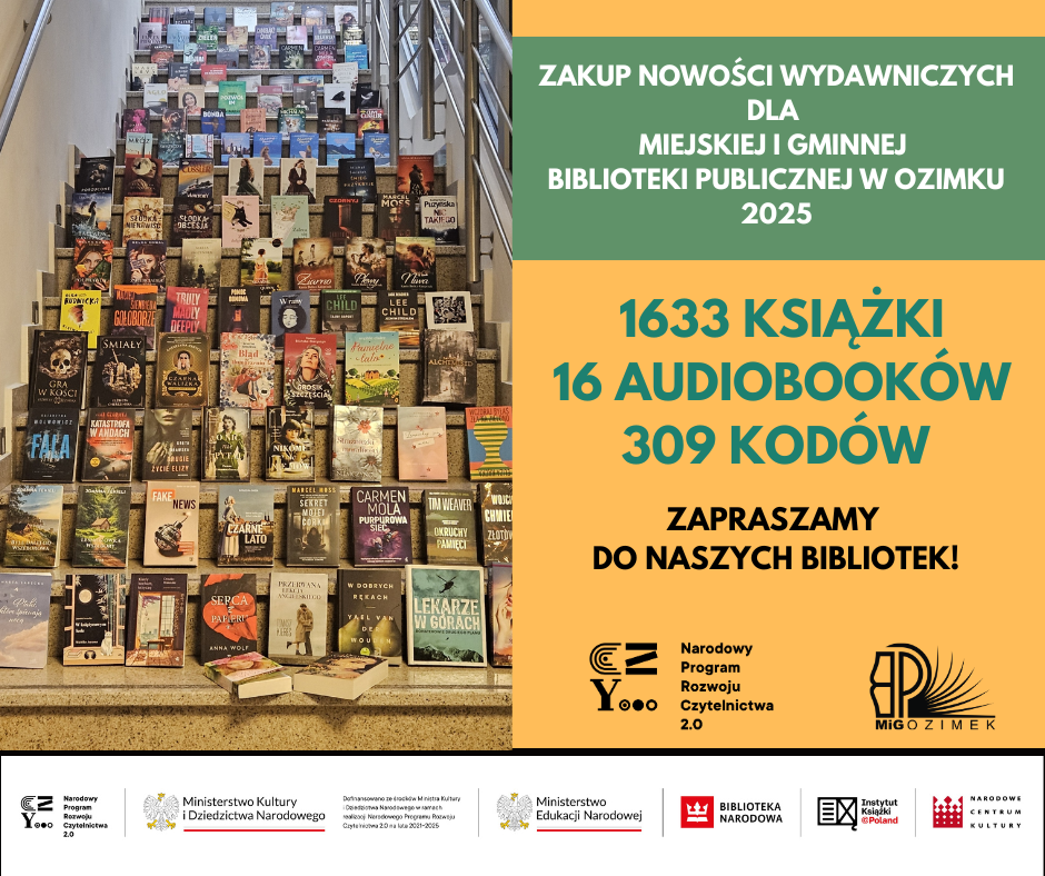 Serdecznie zapraszamy do wszystkich naszych bibliotek po nowości wydawnicze zakupione w ramach realizacji Narodowego Programu Rozwoju Czytelnictwa 2.0 na lata 2021 – 2025. W tym roku do naszych placówek trafiły łącznie 1633 książki tradycyjne oraz 16 audiobooków. Ponadto opłaciliśmy 309 miesięcznych kodów dostępu do e-booków, audiobooków i synchrobooków na platformach: legimi oraz empikgo.
