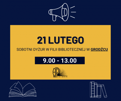 W najbliższą sobotę, tj 21 lutego, nasza Filia Biblioteczna w Grodźcu będzie otwarta. Zapraszamy w godzinach 9.00 - 13.00. Jednocześnie informujemy, że w związku z tym placówka będzie nieczynna w czwartek 26 lutego 2026 roku.