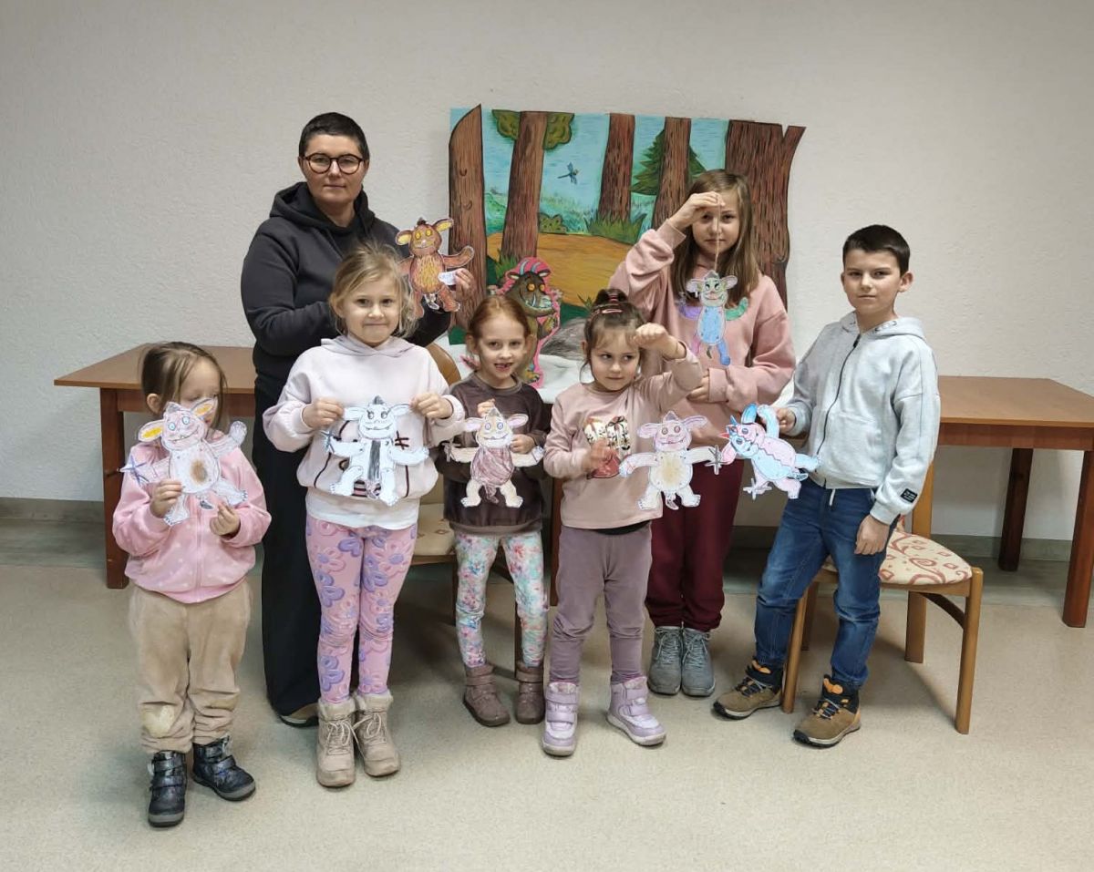 Podczas spotkania dzieci wysłuchały opowiadania w dwóch językach – najpierw w języku polskim, a następnie w języku angielskim. Dwujęzyczna forma czytania pozwoliła uczestnikom nie tylko jeszcze lepiej zrozumieć historię, ale także oswoić się z angielskim słownictwem w naturalny i przyjazny sposób. Po lekturze przyszedł czas na zadania przygotowane w oparciu o treść książki. Dzieci z dużym zaangażowaniem rozwiązywały zagadki, odpowiadały na pytania i wykonywały ćwiczenia sprawdzające ich spostrzegawczość oraz znajomość przygód małego Gruffalo. Ostatnią część zajęć wypełniły warsztaty plastyczne. Wspólnie wykonaliśmy zawieszki przedstawiające Dziecko Gruffalo, które dzieci mogły zabrać ze sobą do domu. Kreatywna praca sprawiła wszystkim wiele radości i była doskonałym zwieńczeniem spotkania.