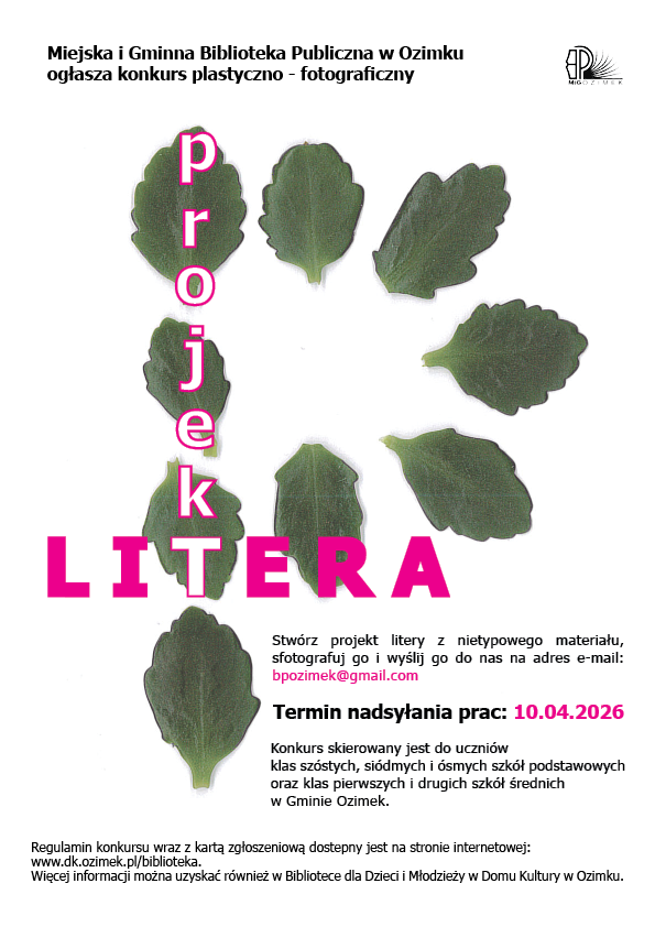 Oddział dla Dzieci i Młodzieży Miejskiej i Gminnej Biblioteki Publicznej w Ozimku ogłasza konkurs plastyczno - fotograficzny pn. "Projekt Litera". Rozwiń skrzydła swojej kreatywności: stwórz projekty liter z nietypowego materiału, sfotografuj je i wyślij do nas.