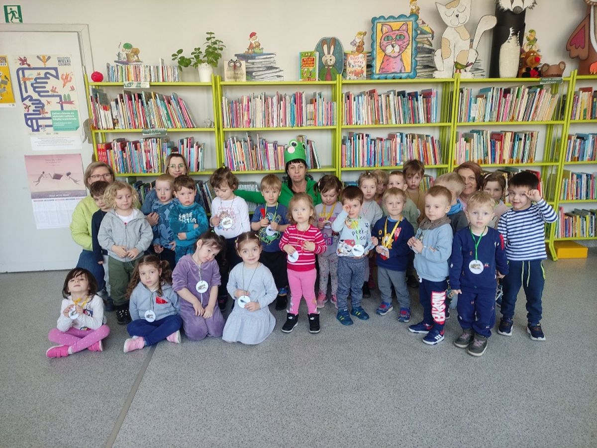 W dniu 11 marca 2026 r. biblioteka dla dzieci zamieniła się na kilka chwil w środowisko przyjazne żabkom. Była łąka, kamyczki i staw. A wszystko to z okazji odwiedzin grupy maluchów z PP nr 4 w Ozimku w związku ze zbliżającym się Dniem Żaby.