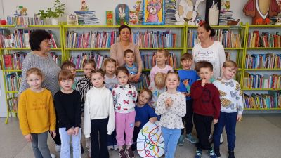 Biblioterka czyta grupie przedszkolaków wiersz "Jajko"  Jana Brzechwy.