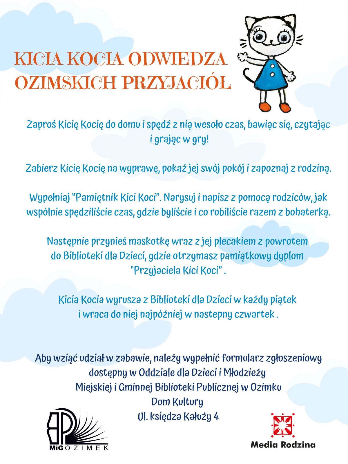 - Prosimy o przesłanie na adres bpdladzieci@dk.ozimek.pl jednego zdjęcia obrazującego wizytę Kici Koci u przyjaciela. Zdjęcia tę będą publikowane na fanpage’u biblioteki oraz w podsumowaniu akcji na stronie internetowej organizatora.
