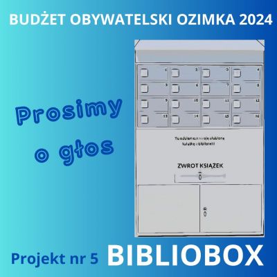 Prosimy mieszkańców miasta o zagłosowanie w Budżecie Obywatelskim Ozimka na projekt nr 5 czyli BIBLIOBOX. Bibliobox to 16-skrytkowa szafa z wbudowaną wrzutnią na zwroty zbiorów wypożyczonych z Biblioteki Miejskiej, która zostanie ustawiona przed wejściem do Domu Kultury w Ozimku. Dzięki temu osoby, które nie mogą dotrzeć do naszej biblioteki w godzinach jej pracy, będą mogły o dowolnej porze odebrać zamówione książki lub zwrócić materiały wcześniej wypożyczone. Głosowanie trwa do 21 lutego 2024.