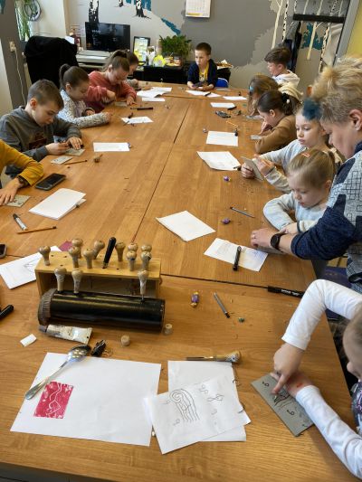 W minioną sobotę odbyły się warsztaty linorytu, podczas których można było spróbować swoich sił w jednej z najstarszych technik druku wypukłego. Uczestnicy za pomocę dłutka wykonali matrycę projektu, która następnie za pomocą prasy graficznej została odbita na papierze. Agnieszka Jarocka, która prowadziła warsztaty, była pod wrażeniem postępu pracy obu uczestniczących w warsztatach grup.