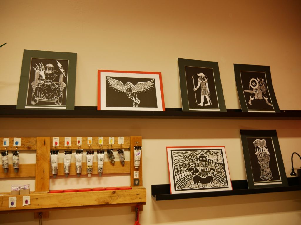 Mitycznie – pod takim tytułem odbył się w ubiegłą sobotę wernisaż prac wykonanych w pracowni grafiki warsztatowej, działającej w naszym domu kultury pod kierunkiem pani Agnieszki Jarockiej. Wernisaż skromny, gdyż ograniczony tak do miejsca ekspozycji jak i ilości artystek wystawiających swoje prace. Panie: Urszula Maciantowicz i Marzena Kasperska El Khalfi skupiły się na tematach mitologicznych, a jednym z cichych bohaterów wystawy został zupełnie niemitologiczny jamniczek, który osobiście postanowił pojawić się także na wernisażu. Trudno powiedzieć, czy działalność jego właścicielki robi na nim większe wrażenie, ale że ją kocha i w trakcie wernisażu nie spuszcza z Niej oka – jest oczywiste.