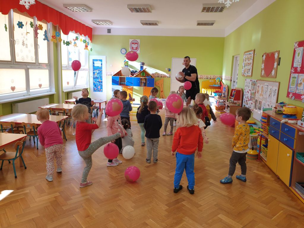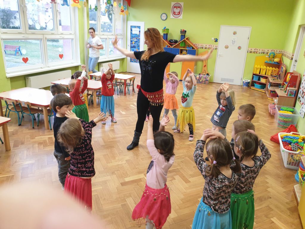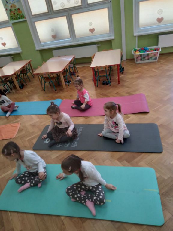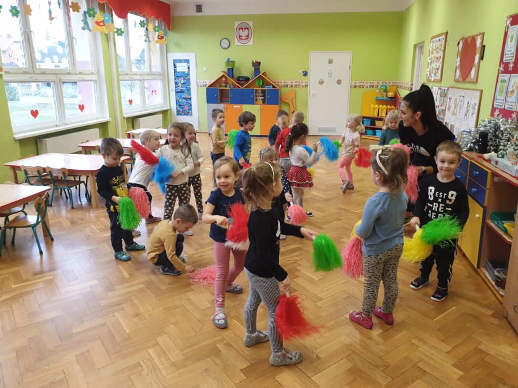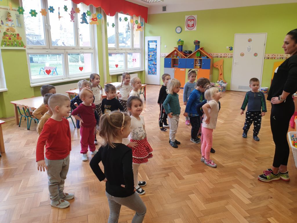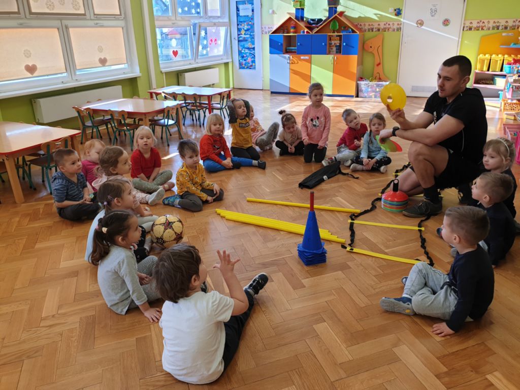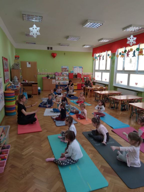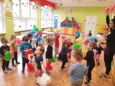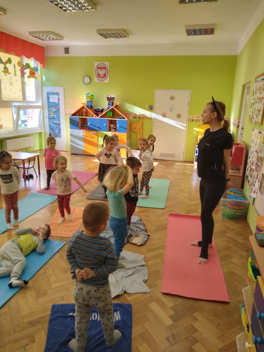 W lutym, w grupie Ekodzieciaków zrealizowałam autorski projekt edukacyjny "W zdrowym ciele zdrowy duch". Zaprosiłam do współpracy praktyków, profesjonalistów i pasjonatów różnych form aktywności fizycznej. Głównym celem było przybliżenie wychowankom nowych sposobów spędzania wolnego czasu oraz zachęcanie do regularnej aktywności. Pierwsze spotkanie poprowadziłam samodzielnie. Dzieci miały okazję poznać świat jogi poprzez udział w opowieści ruchowej z jej elementami. Przy dźwiękach muzyki relaksacyjnej wykonały poranną gimnastykę z Kotkiem Psotkiem. Dzieci podczas spotkania doskonaliły oddech, koncentrację, elastyczność mięśni, koordynację ruchową oraz równowagę. Kolejne zajęcia odbyły się z Panią Tatianą Kowalczyk, instruktorką tańca orientalnego. Tym razem przedszkolaki trenowały poszczególne części ciała i partie mięśni. Tempo ruchów nadawały dźwięki muzyki. Koordynację słuchowo-ruchową wzmagały i uatrakcyjniały specjalne akcesoria (chusty z metalowymi ozdobami, wachlarze).  Zarówno chłopcy i dziewczęta mieli swój udział przy tworzeniu końcowego tańca. Trzecia odsłona projektu, to spotkanie z Panią Darią Bejm, trenerką roku 2021 wg plebiscytu w naszej gminie. Na co dzień trenerką zespołu Diament. Ekodzieciaki podczas spotkania miały okazję poznać zasady występów na scenie, prawidłową postawę oraz akcesoria wykorzystywane w tańcu. Kolorowe pompony szeleściły podczas wykonywania układu ruchowego. Tematem ostatnich zajęć była gra zespołowa, piłka nożna. Pan Robert Gabryś, trener młodych drużyn zadbał o porządną rozgrzewkę. Ćwiczyliśmy zwinność, szybkość, koordynację wzrokowo-ruchową oraz wytrwałość w przypadku niepowodzeń. Piłki zastąpiły nam kolorowe balony, które przywodziły na myśl sportową galę.