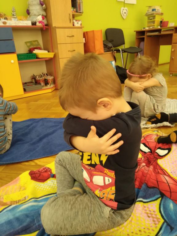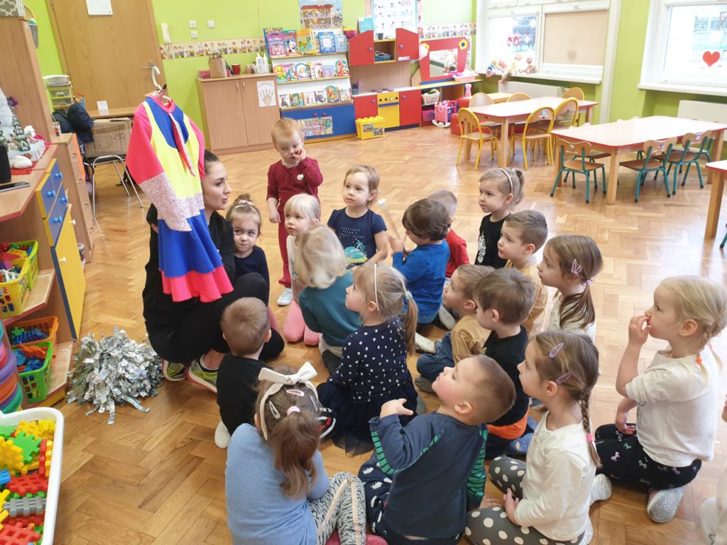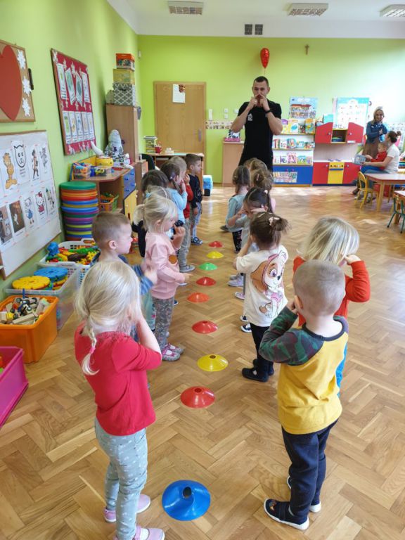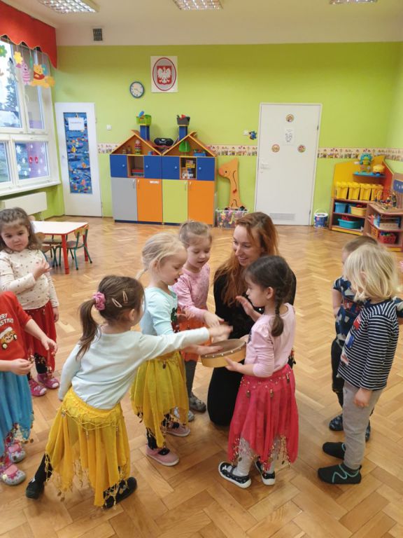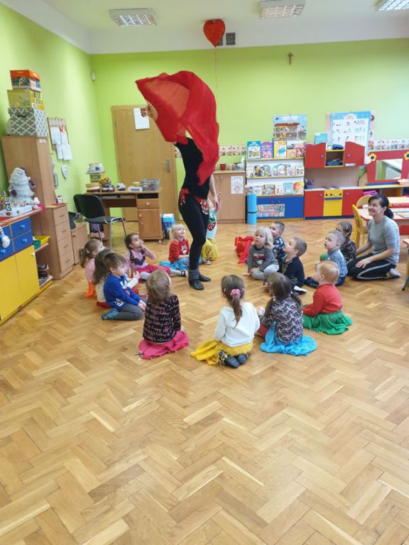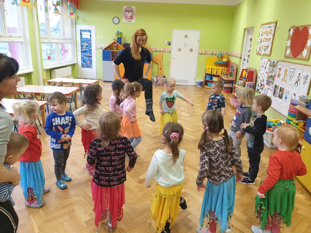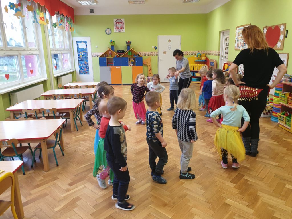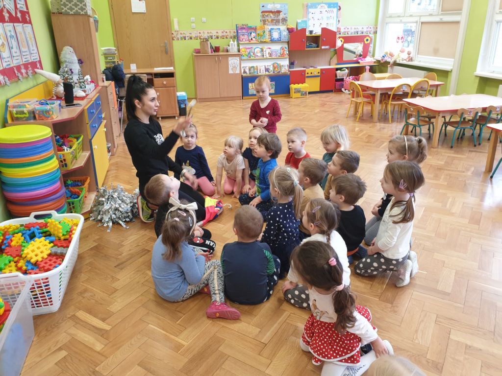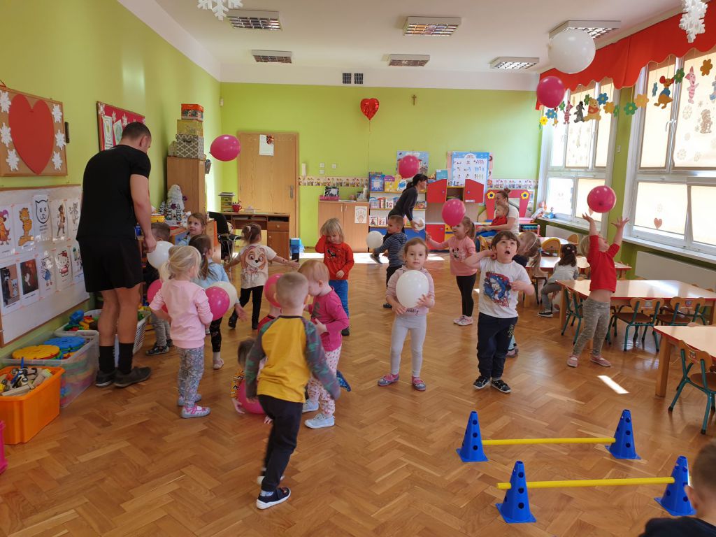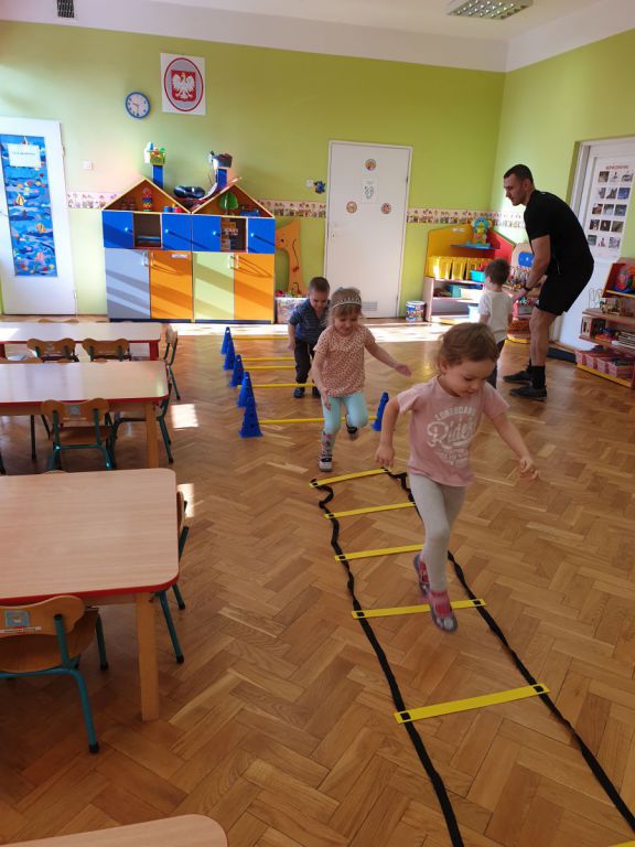 W lutym, w grupie Ekodzieciaków zrealizowałam autorski projekt edukacyjny "W zdrowym ciele zdrowy duch". Zaprosiłam do współpracy praktyków, profesjonalistów i pasjonatów różnych form aktywności fizycznej. Głównym celem było przybliżenie wychowankom nowych sposobów spędzania wolnego czasu oraz zachęcanie do regularnej aktywności. Pierwsze spotkanie poprowadziłam samodzielnie. Dzieci miały okazję poznać świat jogi poprzez udział w opowieści ruchowej z jej elementami. Przy dźwiękach muzyki relaksacyjnej wykonały poranną gimnastykę z Kotkiem Psotkiem. Dzieci podczas spotkania doskonaliły oddech, koncentrację, elastyczność mięśni, koordynację ruchową oraz równowagę. Kolejne zajęcia odbyły się z Panią Tatianą Kowalczyk, instruktorką tańca orientalnego. Tym razem przedszkolaki trenowały poszczególne części ciała i partie mięśni. Tempo ruchów nadawały dźwięki muzyki. Koordynację słuchowo-ruchową wzmagały i uatrakcyjniały specjalne akcesoria (chusty z metalowymi ozdobami, wachlarze).  Zarówno chłopcy i dziewczęta mieli swój udział przy tworzeniu końcowego tańca. Trzecia odsłona projektu, to spotkanie z Panią Darią Bejm, trenerką roku 2021 wg plebiscytu w naszej gminie. Na co dzień trenerką zespołu Diament. Ekodzieciaki podczas spotkania miały okazję poznać zasady występów na scenie, prawidłową postawę oraz akcesoria wykorzystywane w tańcu. Kolorowe pompony szeleściły podczas wykonywania układu ruchowego. Tematem ostatnich zajęć była gra zespołowa, piłka nożna. Pan Robert Gabryś, trener młodych drużyn zadbał o porządną rozgrzewkę. Ćwiczyliśmy zwinność, szybkość, koordynację wzrokowo-ruchową oraz wytrwałość w przypadku niepowodzeń. Piłki zastąpiły nam kolorowe balony, które przywodziły na myśl sportową galę.