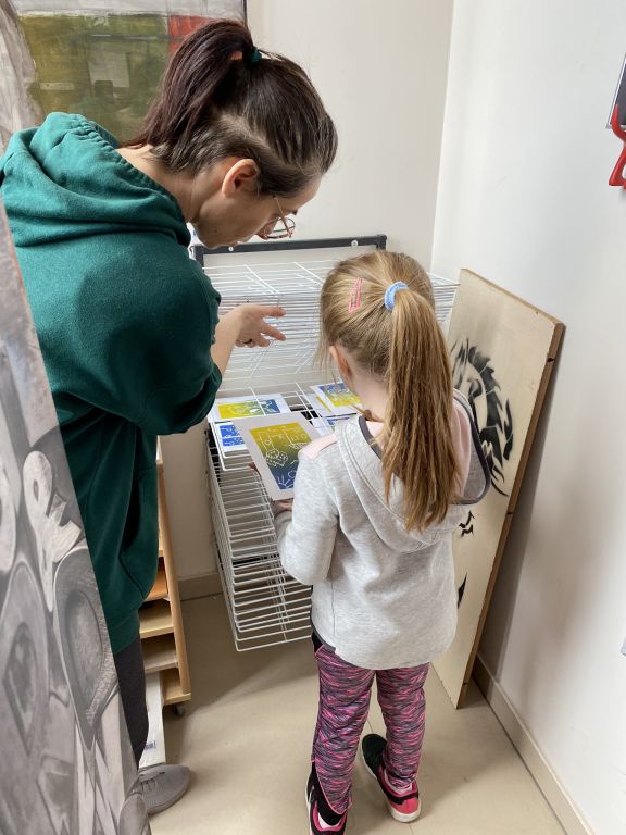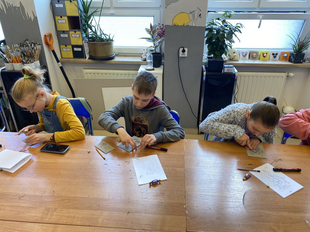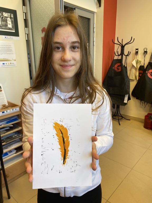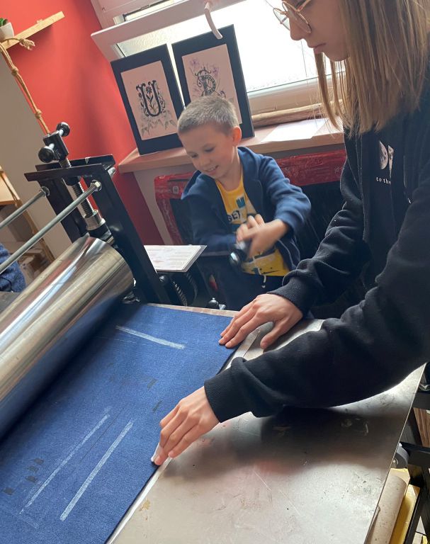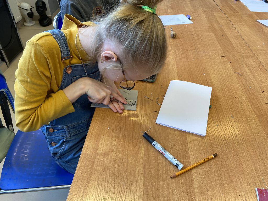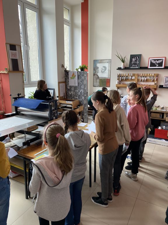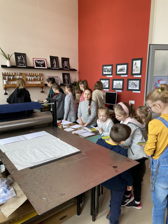 W minioną sobotę odbyły się warsztaty linorytu, podczas których można było spróbować swoich sił w jednej z najstarszych technik druku wypukłego. Uczestnicy za pomocę dłutka wykonali matrycę projektu, która następnie za pomocą prasy graficznej została odbita na papierze. Agnieszka Jarocka, która prowadziła warsztaty, była pod wrażeniem postępu pracy obu uczestniczących w warsztatach grup.