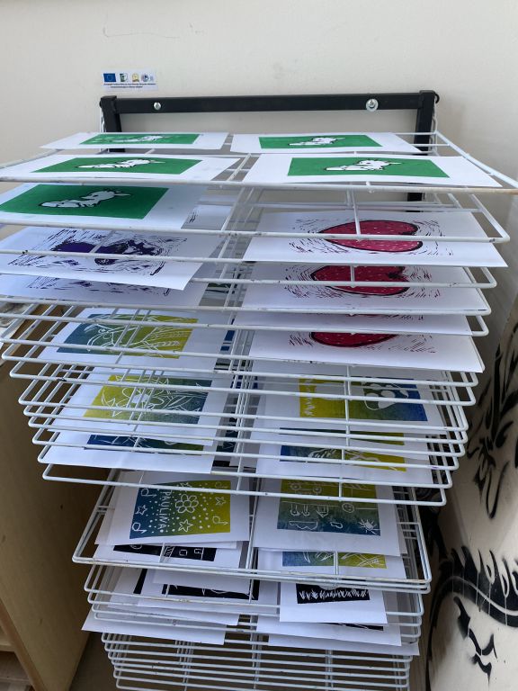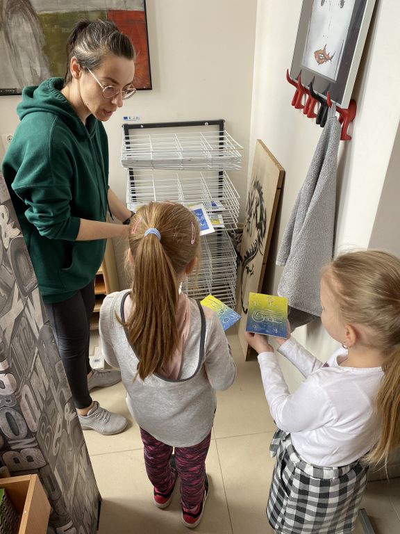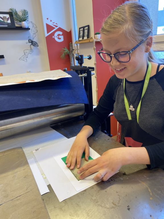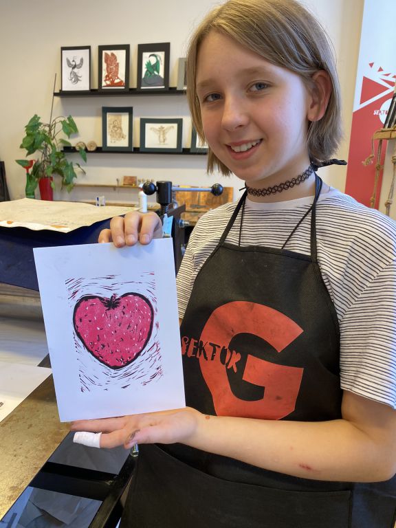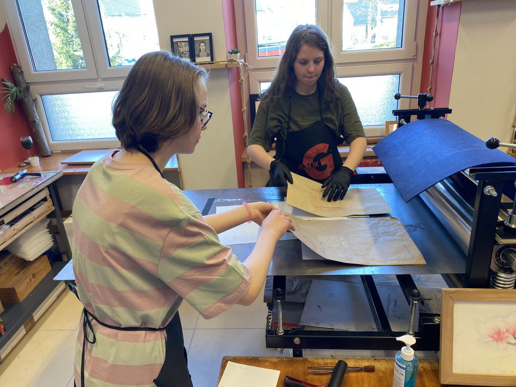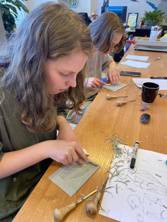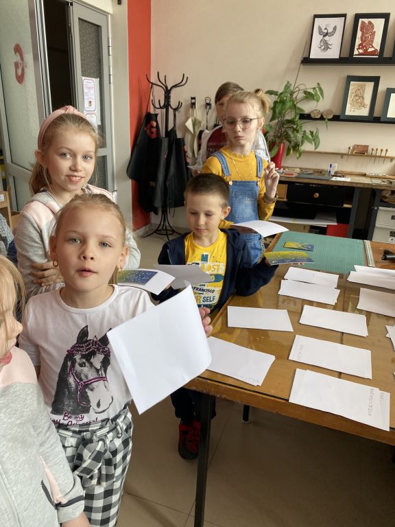 W minioną sobotę odbyły się warsztaty linorytu, podczas których można było spróbować swoich sił w jednej z najstarszych technik druku wypukłego. Uczestnicy za pomocę dłutka wykonali matrycę projektu, która następnie za pomocą prasy graficznej została odbita na papierze. Agnieszka Jarocka, która prowadziła warsztaty, była pod wrażeniem postępu pracy obu uczestniczących w warsztatach grup.