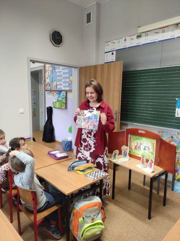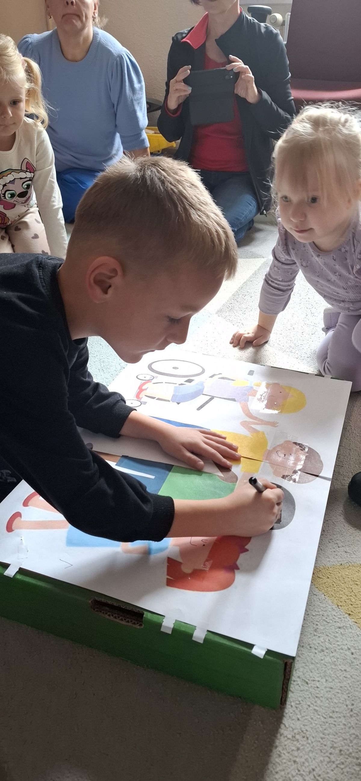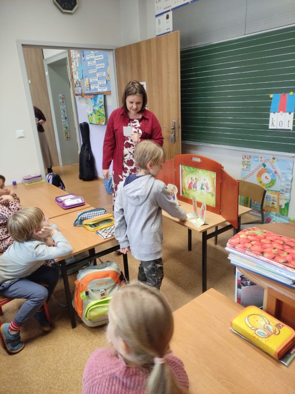 Pierwszoklasiści natomiast wysłuchali bajki w formie teatrzyku kamishibai "Jak Nowatorscy przestali rozmawiać" oraz wzięli udział w pogadance o konieczności budowania dialogu, wyrażania swoich potrzeb oraz dbaniu o najbliższe relacje. Do tematu zostały przygotowane zabawy pomagające w komunikacji i opisywaniu rzeczywistości.