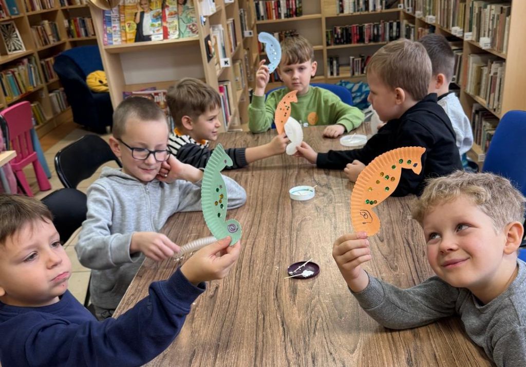 Z uwagi na aurę pogodową w ostatni poniedziałek listopada, zajęcia odbyły się w przedszkolu. Tym razem głównym bohaterem był żółw morski, na temat którego dzieci dowiedziały się kilku nowinek. Potem bawiły się w zabawę: wyścigi żółwików oraz wykonały z papieru własne żółwie. Grudniowe spotkania z morskimi zwierzętami odbyły się już w bibliotece. Pierwszego grudnia przedszkolaki poznały maleńkie pławikoniki, mistrzów podwodnego kamuflażu. Natomiast ósmego grudnia miały zaszczyt gościć samego cesarskiego pingwina.