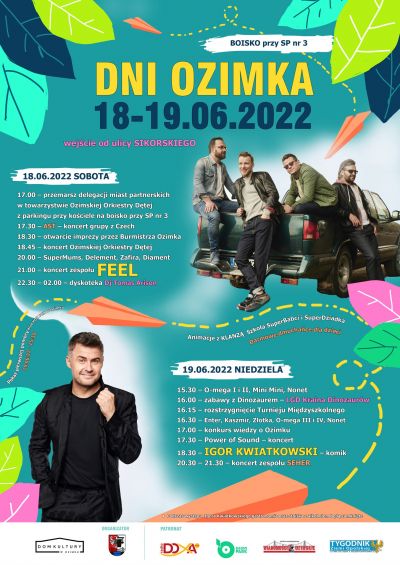 Tegoroczne święto naszego miasta rozpoczął przemarsz delegacji miast partnerskich w towarzystwie Ozimskiej Orkiestry Dętej, który ruszył o godzinie 17.00. Zespół z czeskiego Rymarzowa All Stars Tribute Band rozpoczął program artystyczny, a Burmistrz Ozimka Mirosław Wieszołek oficjalnie otworzył imprezę. Następnie odbył się koncert Ozimskiej Orkiestry Dętej, uwielbianej przez widownię. Następnie odbył się blok taneczny sekcji Domu Kultury w Ozimku oraz gości z Ukrainy. Wystąpiły zespoły: Delement, Diament, Super Mums i Zafira. Gwiazdą wieczoru był zespół Feel, który rozgrzał publiczność do czerowności. Sobotnie imprezowanie zakończyła dyskoteka w rytm znanych przebojów puszczanych przez Dj Tomasa Arisona. Przedstawiamy fotofelację z soboty autorstwa Szymona Początka i Agnieszki Jarockiej Wideorelacja autorstwa Michała Katolika: https://www.youtube.com/watch?v=hhSFGOtZWw0