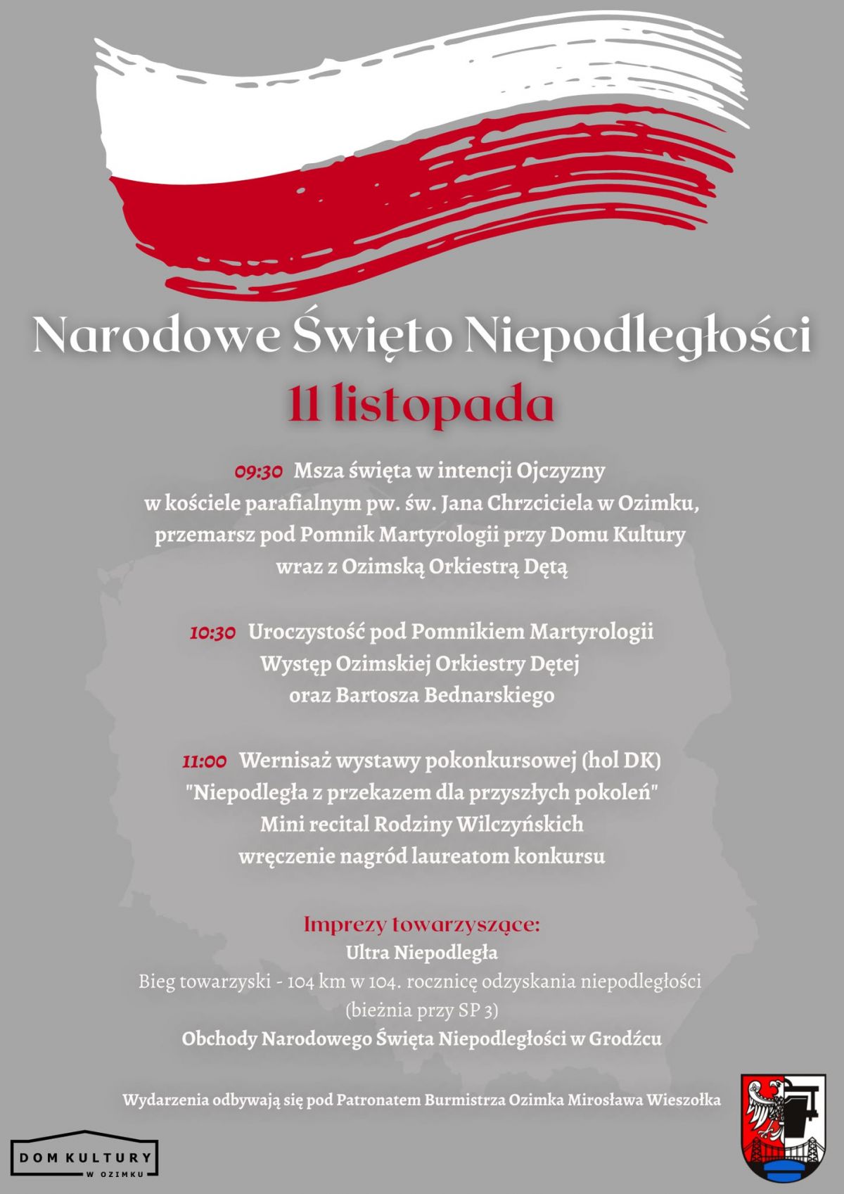 W Święto Niepodległości pod Pomnikiem Martyrologii nastąpiło uroczyste złożenie wiązanek kwiatów przez przedstawicieli samorządu – Burmistrza Ozimka Mirosława Wieszołka oraz Skarbnika Gminy Ozimek Jadwigi Michnik, Wiceprzewodniczącego Rady Miejskiej w Ozimku Marka Elisa oraz Radnych Rady Miejskiej w Ozimku, Radnych Młodzieżowej Rady Miejskiej w Ozimku i Radnych Powiatu Opolskiego. W świętowaniu uczestniczyły również poczty sztandarowe reprezentujące organizacje i instytucje z terenu naszej gminy, przedstawiciele placówek oświatowych, Ochotniczych Straży Pożarnych. Podczas uroczystości odbył się występ Ozimskiej Orkiestry Dętej oraz Bartosza Bednarskiego z Nonet. Następnie zaproszeni goście udali się na wernisaż wystawy pokonkursowej "NIEPODLEGŁA Z PRZEKAZEM DLA PRZYSZŁYCH POKOLEŃ" gdzie nastąpiło wręczenie nagród laureatom konkursu ufundowanych przez Burmistrza Ozimka oraz mini recital rodziny Wilczyńskich.