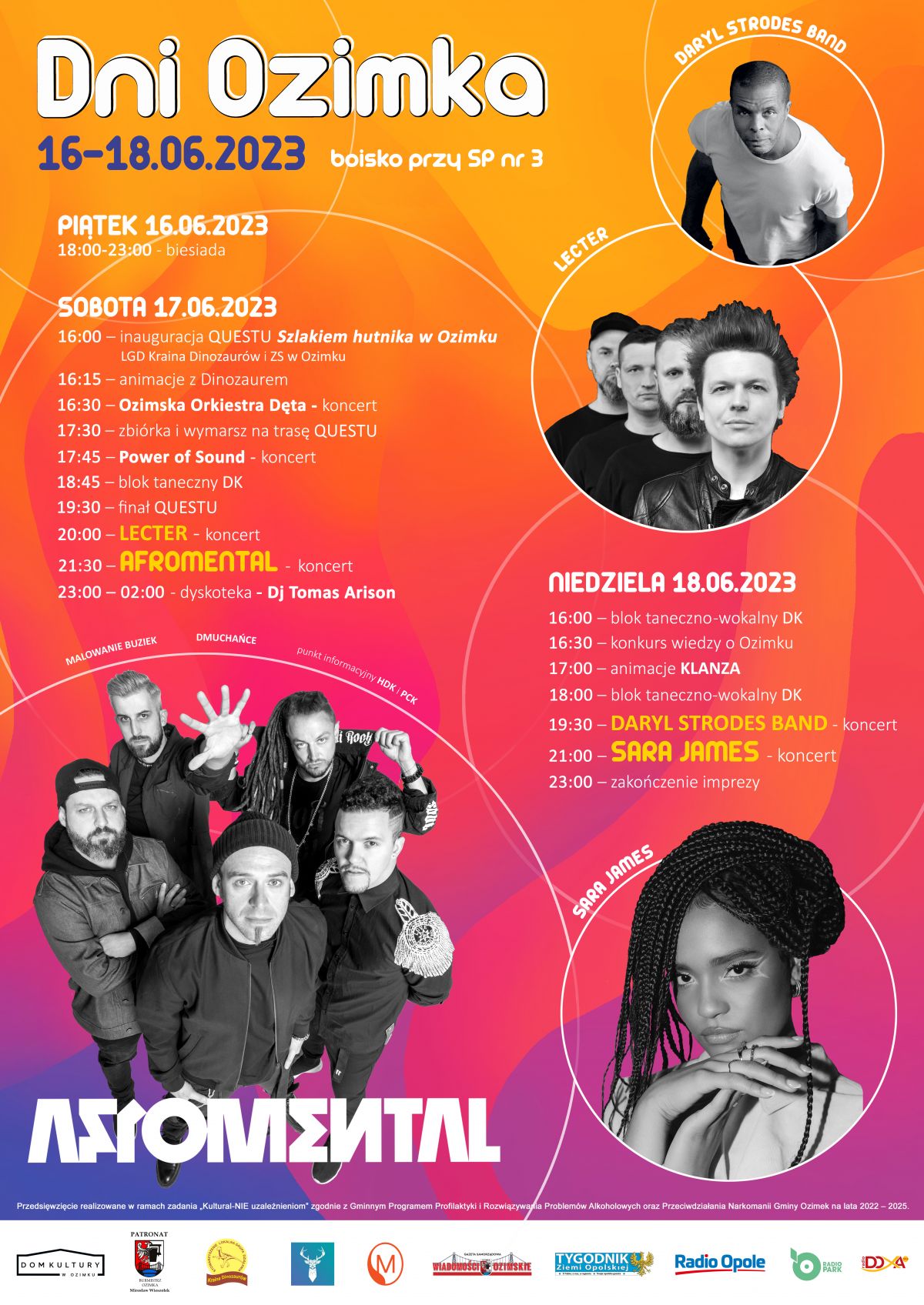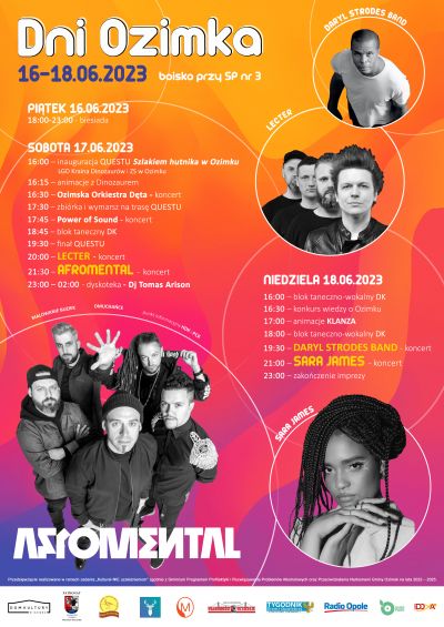 W sobotę byliśmy świadkami wieczornego koncertu zespołu Lecter oraz żywiołowego składu Afromental. Wystąpiła także Ozimska Orkiestra Dęta, razem z zespołem muzycznym Power of Sound. Swoje umiejentości taneczne zaprezentowały zespoły mażoretkowe O-mega. Odbyła się także inauguracja i zakończenie Questu "Szlakiem hutnika w Ozimku" organizowanym przez LGD Kraina Dinozaurów i ZS w Ozimku. Najmłodsi mogli skorzystać z dmuchańców, stoisk z zabawkami, animacji z dinozaurem i wielu innych atrakcji. Imprezę wspierali także Klub HDK PCK Ozimek. Na zakończenie odbyła się dyskoteka z Dj Tomasem Arisonem.
