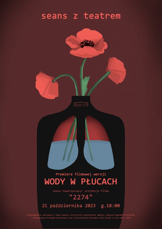 Premiera filmowej wersji jednego z najważniejszych spektakli Teatru Fieter pt. "Woda w płucach", zrealizowanego w 2022 roku z udziałem Justyny Mehl i Roberta Konowalika. Tego wieczoru publiczność mogła również obejrzeć powtórną prezentację filmu dokumentalnego pt. "2274", którego bohaterem jest twórca wędrownego, rowerowego Teatru Miejsca - Robert Poryziński. W przerwie można było porozmawiać i napić się herbaty. Oba filmy w reżyserii Roberta Konowalika. Przedsięwzięcie było realizowane w ramach zadania „Kultural-NIE uzależnieniom” zgodnie z Gminnym Programem Profilaktyki i Rozwiązywania Problemów Alkoholowych oraz Przeciwdziałania Narkomanii Gminy Ozimek na lata 2022–2025.