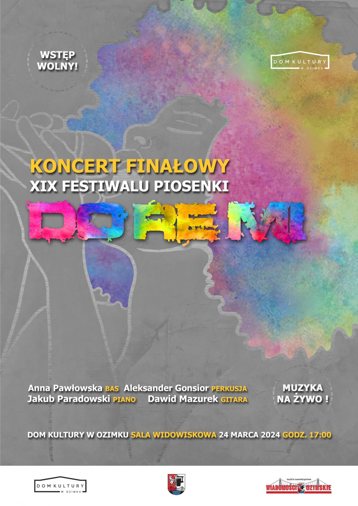 XIX Festiwal Piosenki DO-RE-MI odbył się pod honorowym patronatem Burmistrza Ozimka Mirosława Wieszołka. Patronaty medialne nad naszą imprezą objęli: Radio Doxa, Radio Opole, Wiadomości Ozimskie oraz Tygodnik Ziemi Opolskiej.