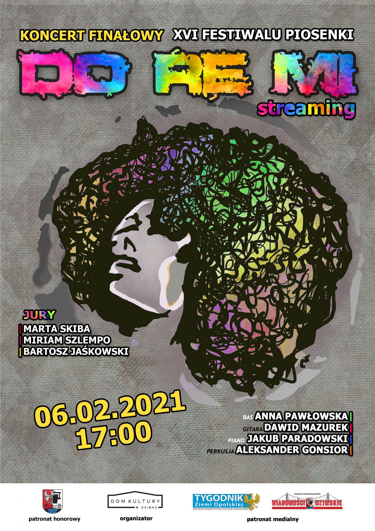 XVI Festiwal Piosenki DO-RE-MI już za nami. W sali widowiskowej naszego Domu Kultury odbył się Koncert Finałowy Festiwalu. Ze względu na panujące obostrzenia przesłuchania odbyły się bez udziału publiczności. Podczas Koncertu zaprezentowało się dwudziestu uczestników wyłonionych spośród 30 nadesłanych zgłoszeń w 4 kategoriach wiekowych: klasy I-III, klasy IV-VI, klasy VII-VIII, uczniowie szkół ponadpodstawowych i dorośli. Wszystkim wykonawcom towarzyszył zespół akompaniujący w składzie: Anna Pawłowska – bas, Dawid Mazurek – gitara, Jakub Paradowski – piano, Aleksander Gonsior – perkusja.