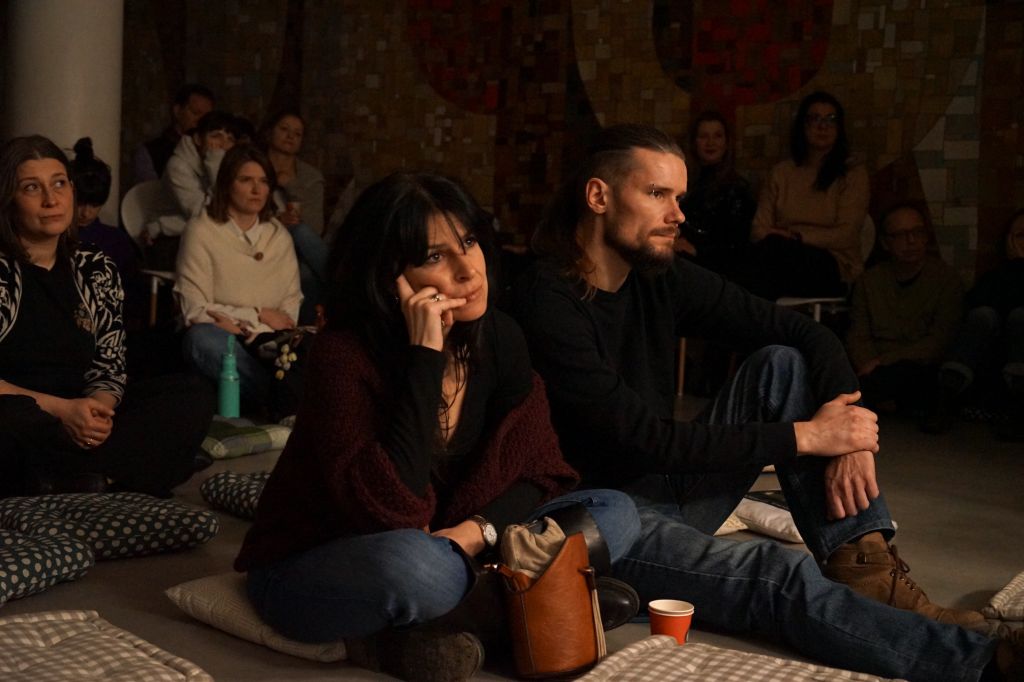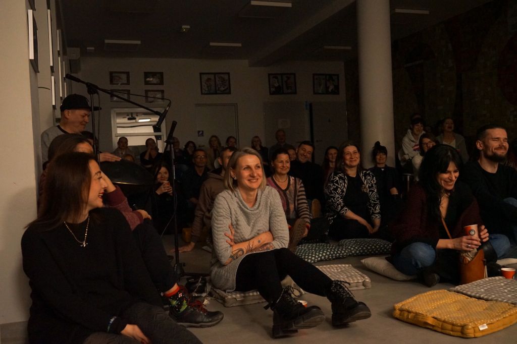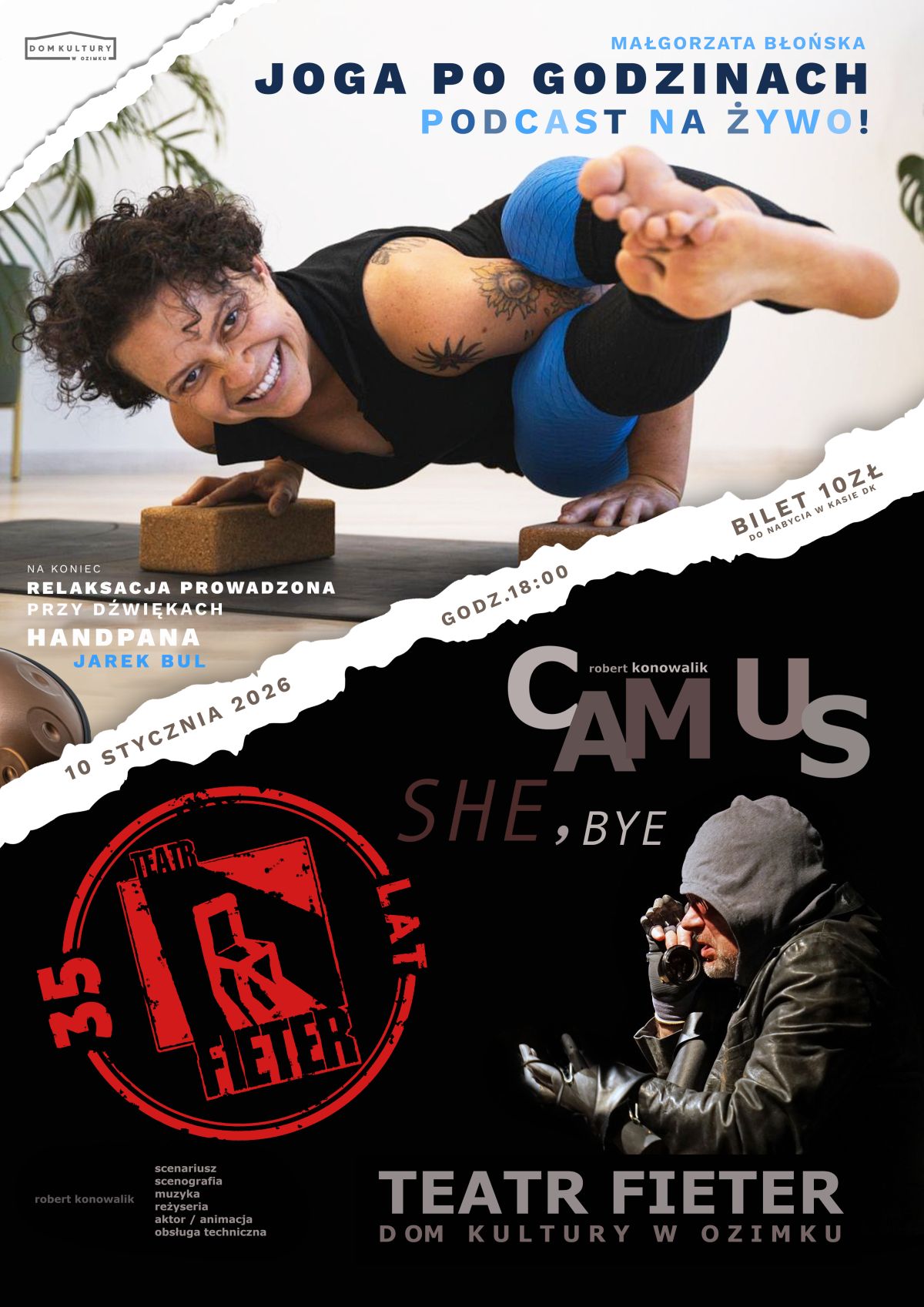 Po krótkiej przerwie i poczęstunku widownia została zaproszona do sali kameralnej, gdzie uczestniczyła w nietypowym nagraniu podcastu Joga po godzinach. Internetowe rozmowy na temat jogi, realizowane są obecnie w ramach trzeciego sezonu tego podcastu przez Małgorzatę Błońską i Roberta Konowalika. Z okazji teatralnego jubileuszu specjalny odcinek nagrywany był w sobotni wieczór w „nieco większym gronie”. Publiczność wzięła udział w konkursie, w którym stawką była książka Małgorzaty Błońskiej „Pistacja w krainie smoków”, mogła zadawać pytania a na koniec wzięła udział w relaksacji przy wtórze bębna handpan, na którym nieprzerwanie tworzył oprawę muzyczną podczas całego spotkania - Jarek Bul, specjalizujący się, między innymi, w graniu na tym niezwykłym, metalowym bębnie podczas zajęć jogi. Nad stroną techniczną nagrania czuwał Andrzej Wilczyński, a tematem odcinka były „Mity na temat jogi”. Dziękujemy za uczestnictwo w naszym spotkaniu i zapraszamy na kolejne.