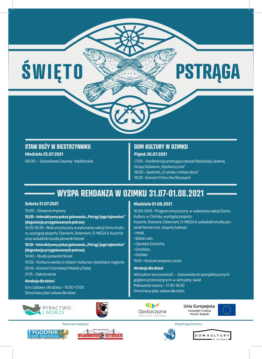 Święto Pstrąga to impreza zrealizowana w ramach projektu współfinansowanego przez Unię Europejską ze środków Europejskiego Funduszu Morskiego i Rybackiego w ramach Programu Operacyjnego "Rybactwo i Morze". Organizatorem wydarzenia była Gmina Ozimek, natomiast Dom Kultury w Ozimku był jego współorganizatorem.
