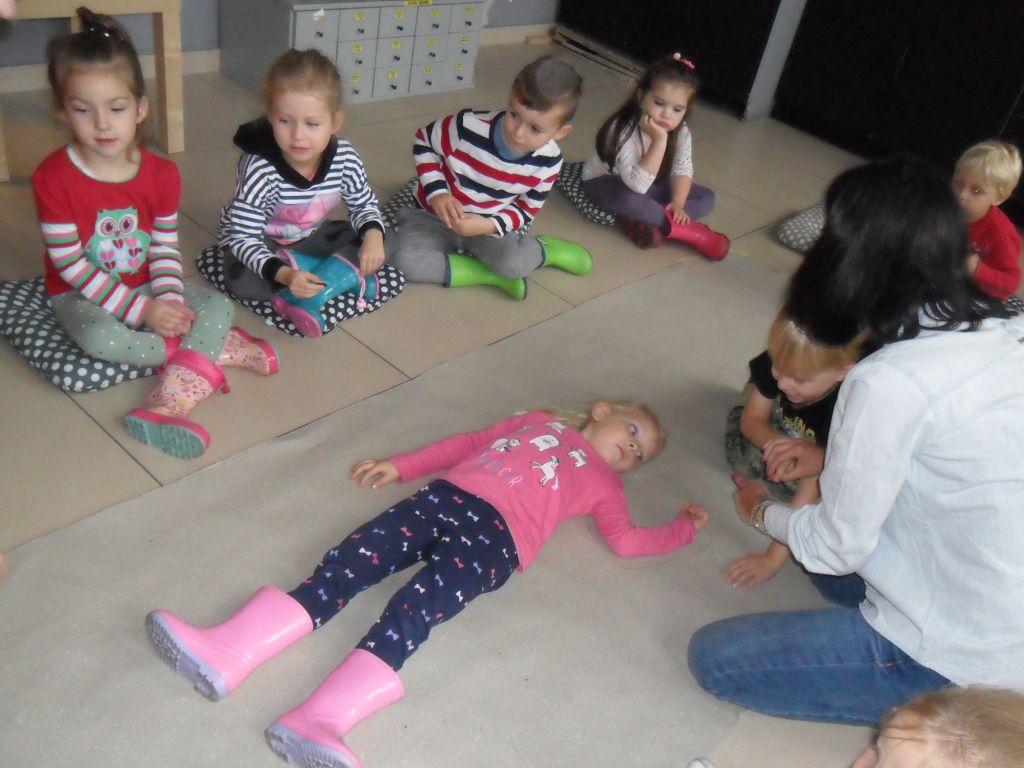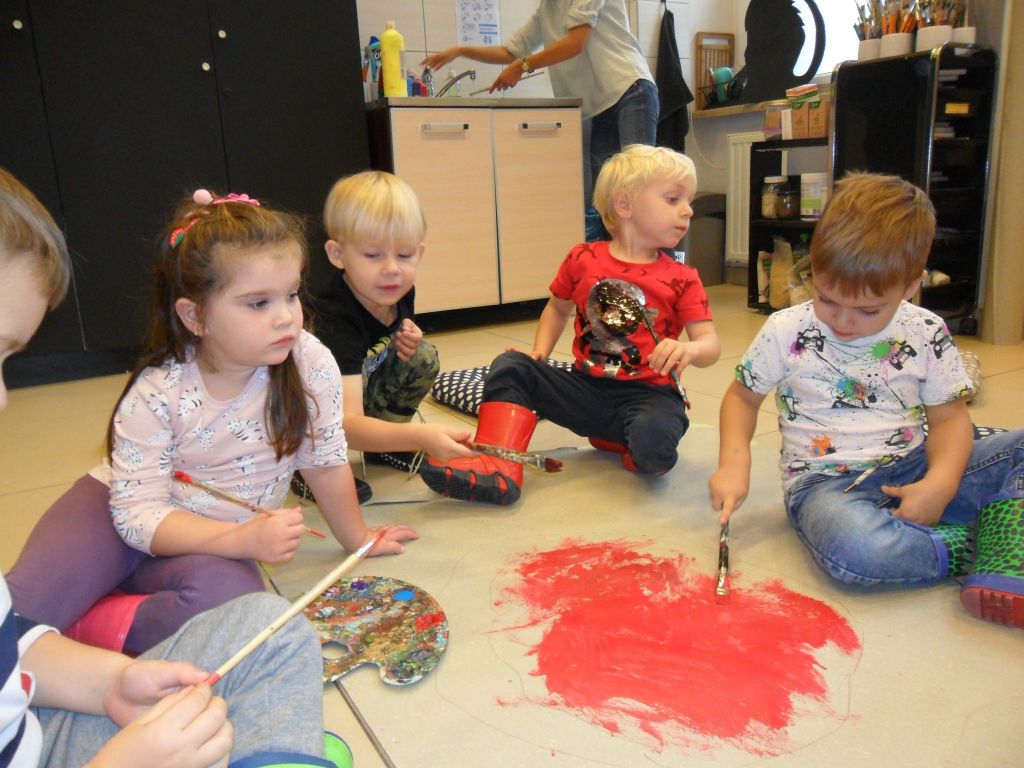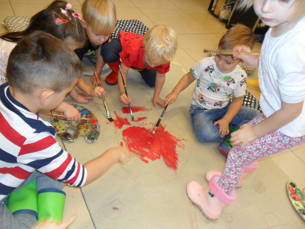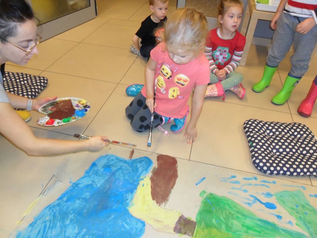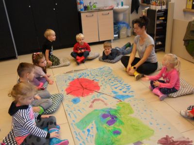 Gdy postać Przedszkolaka…trzymała w dłoni czerwony parasol, dzieci zgodnie stwierdziły, że do zwieńczenia dzieła potrzebne jest błotko. Tak jak wcześniej sprawnie stworzyły z kolorów podstawowych(żółty, niebieski, czerwony) brakujące barwy uzupełniające (zielony, fioletowy), tak i tym razem nie było problemu by stworzyć kolor błotny czyli brązowy.