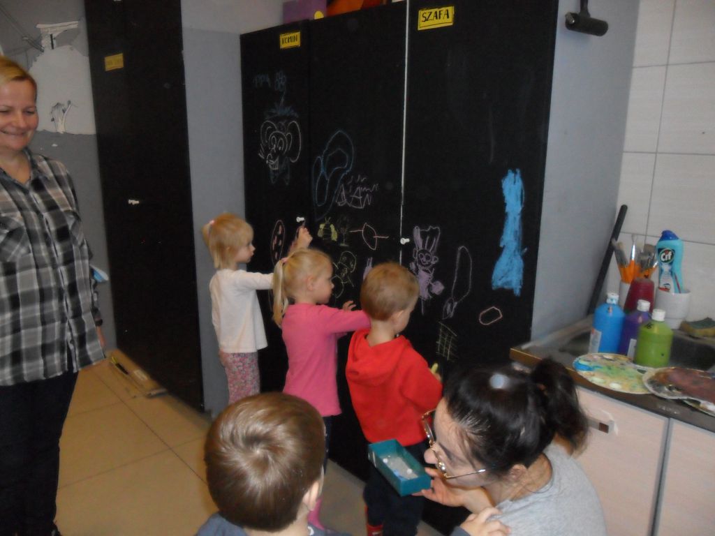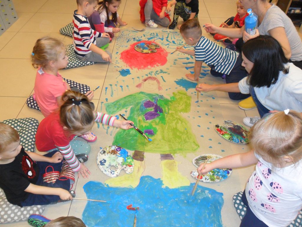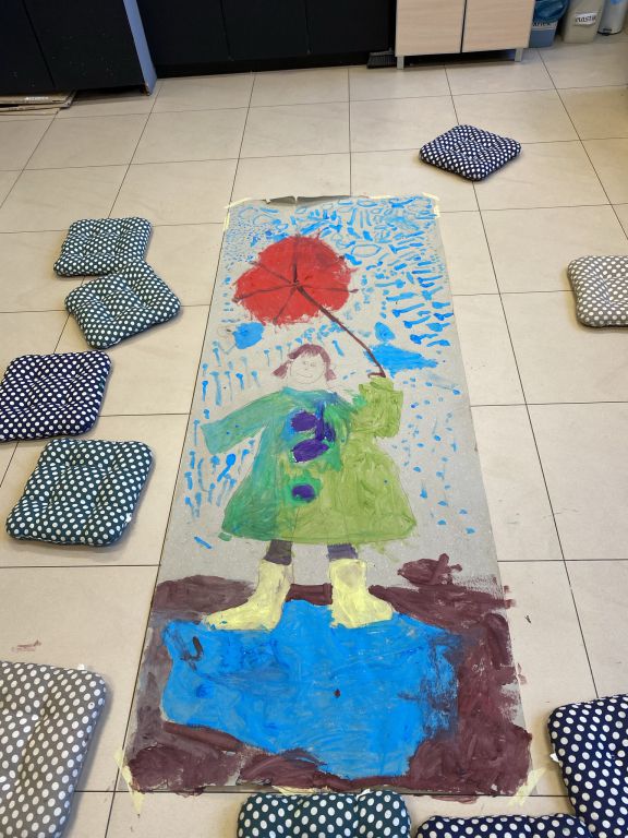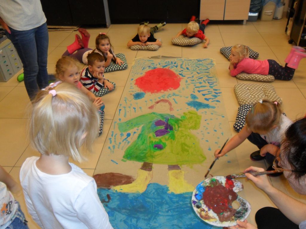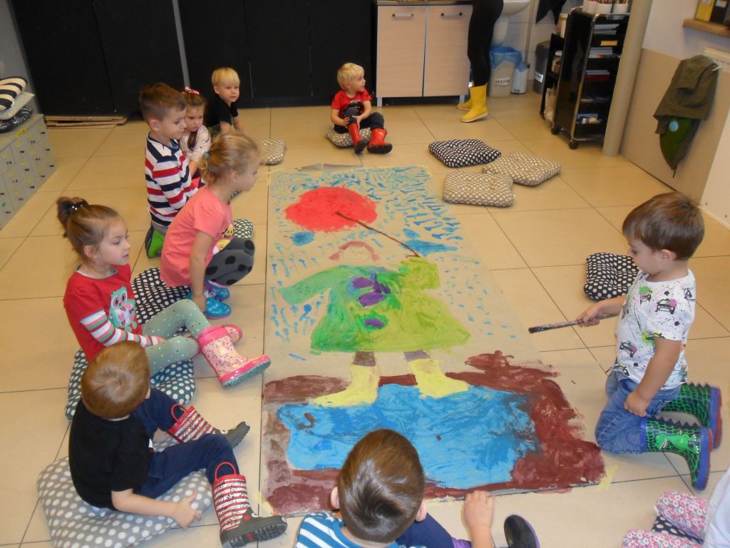 W sali plastycznej czekał na nich ogromny arkusz papieru na którym uczestnicy warsztatów mieli stworzyć Przedszkolaka zaklinającego deszcz. Nie czekając długo, obrysowali pierwszą ochotniczkę. Następnie kreska po kresce, guzik po guziku ubierali kolorowego przedszkolaka w kalosze, płaszcz. Każdy z uczestników zajął się wypełnianiem barwnymi plamami stworzonego przez grupę szkicu.