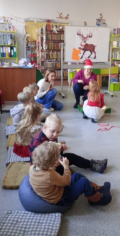 Po tej części przyszedł czas na chwilę relaksu i posłuchanie bajeczki o rodzinie misiów czekających na święta przedstawionej w książce „Gdzie jest Mikołaj?”. Natomiast starsza grupa przedszkolaków na podstawie książki  „Pierwsza gwiazdka Świętego Mikołaja” poznała historię tradycji obchodzenia świąt przez elfy i samego Mikołaja.